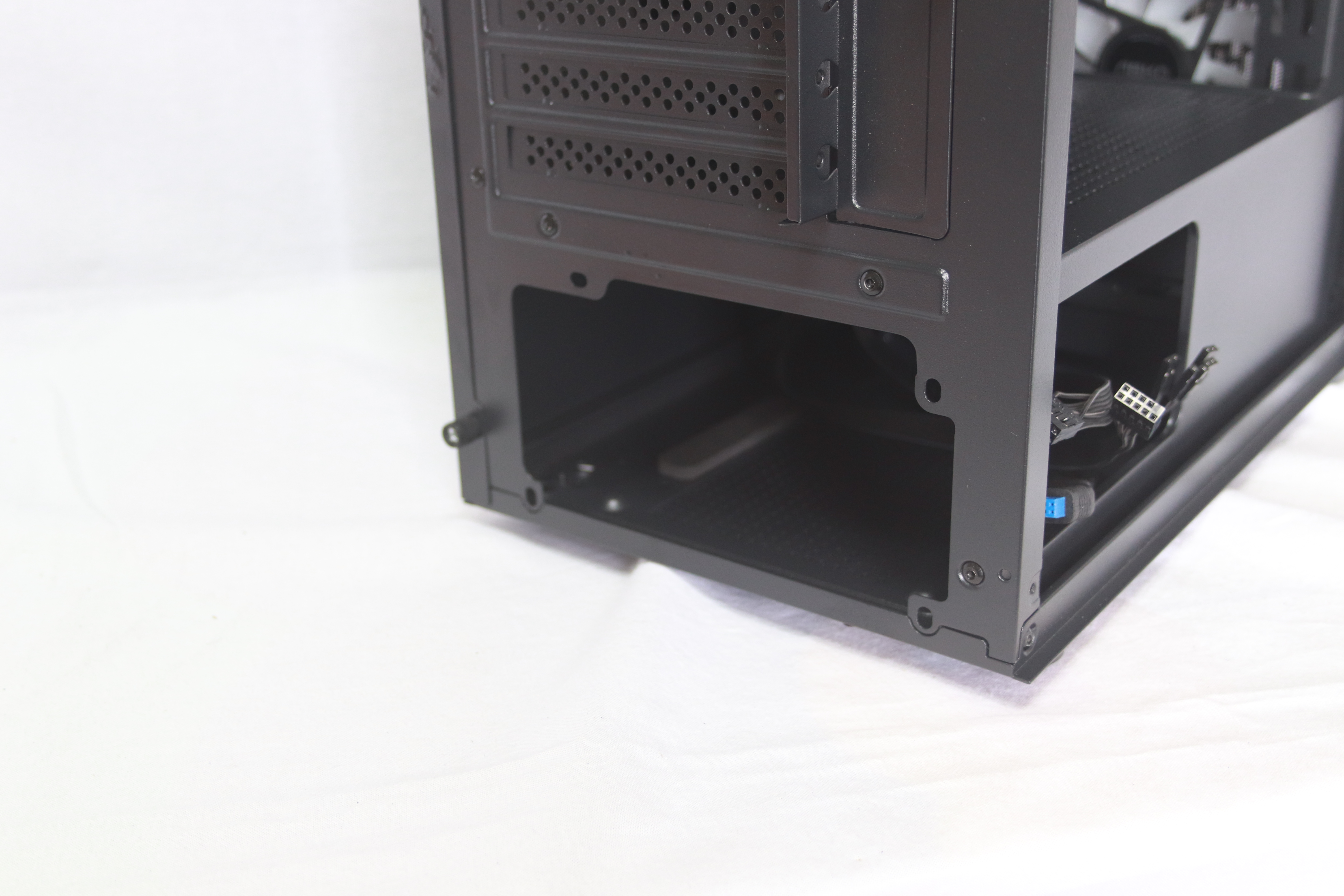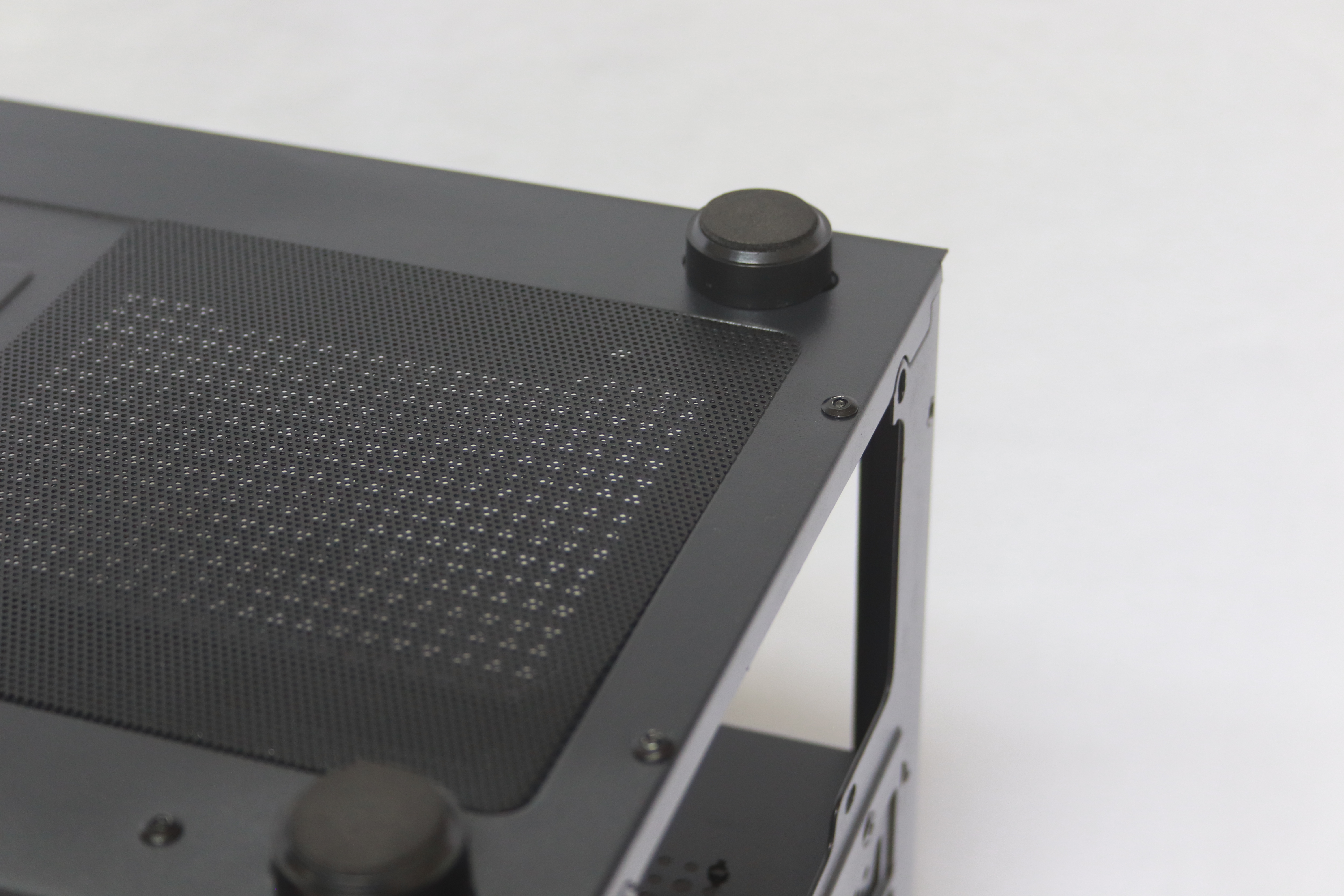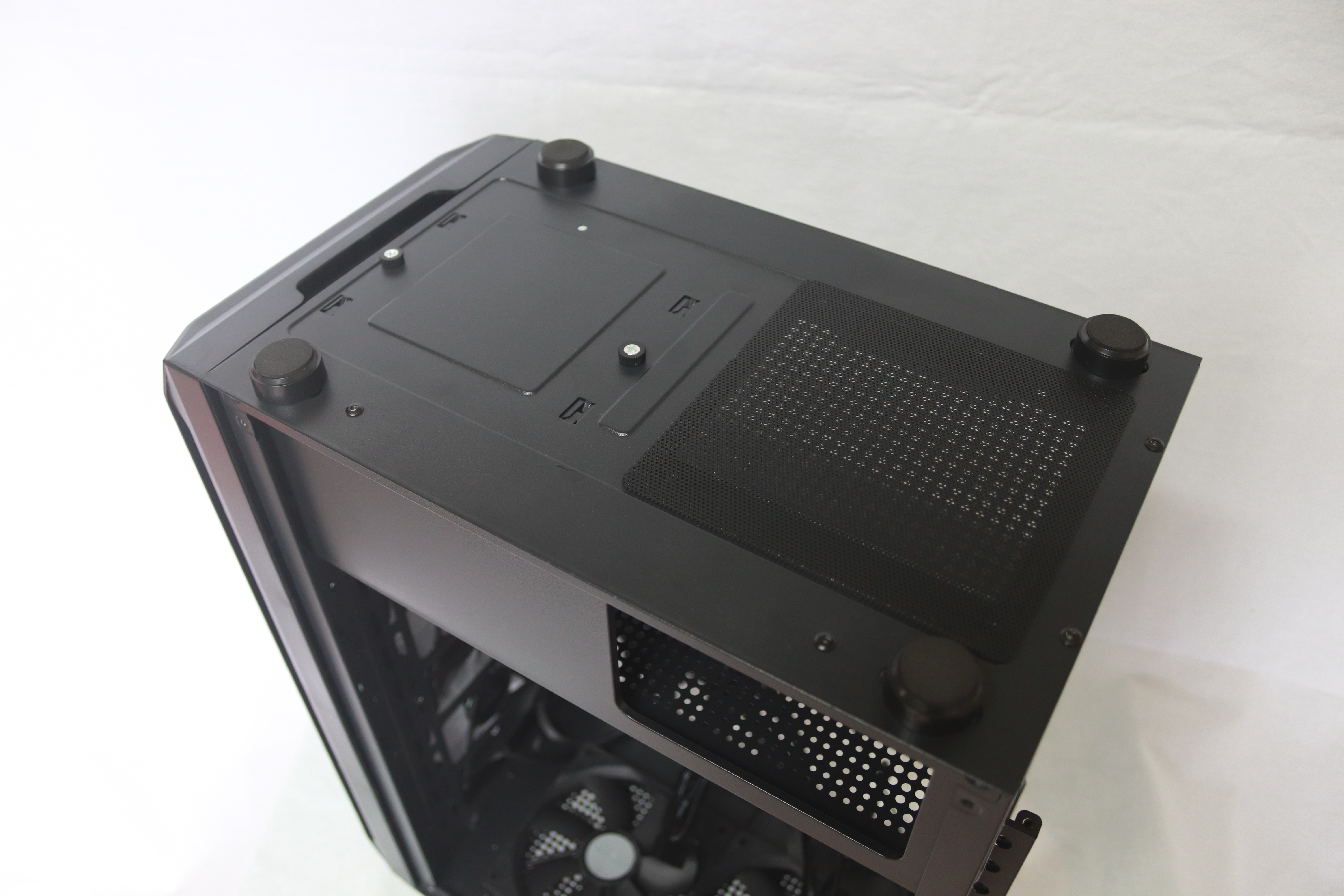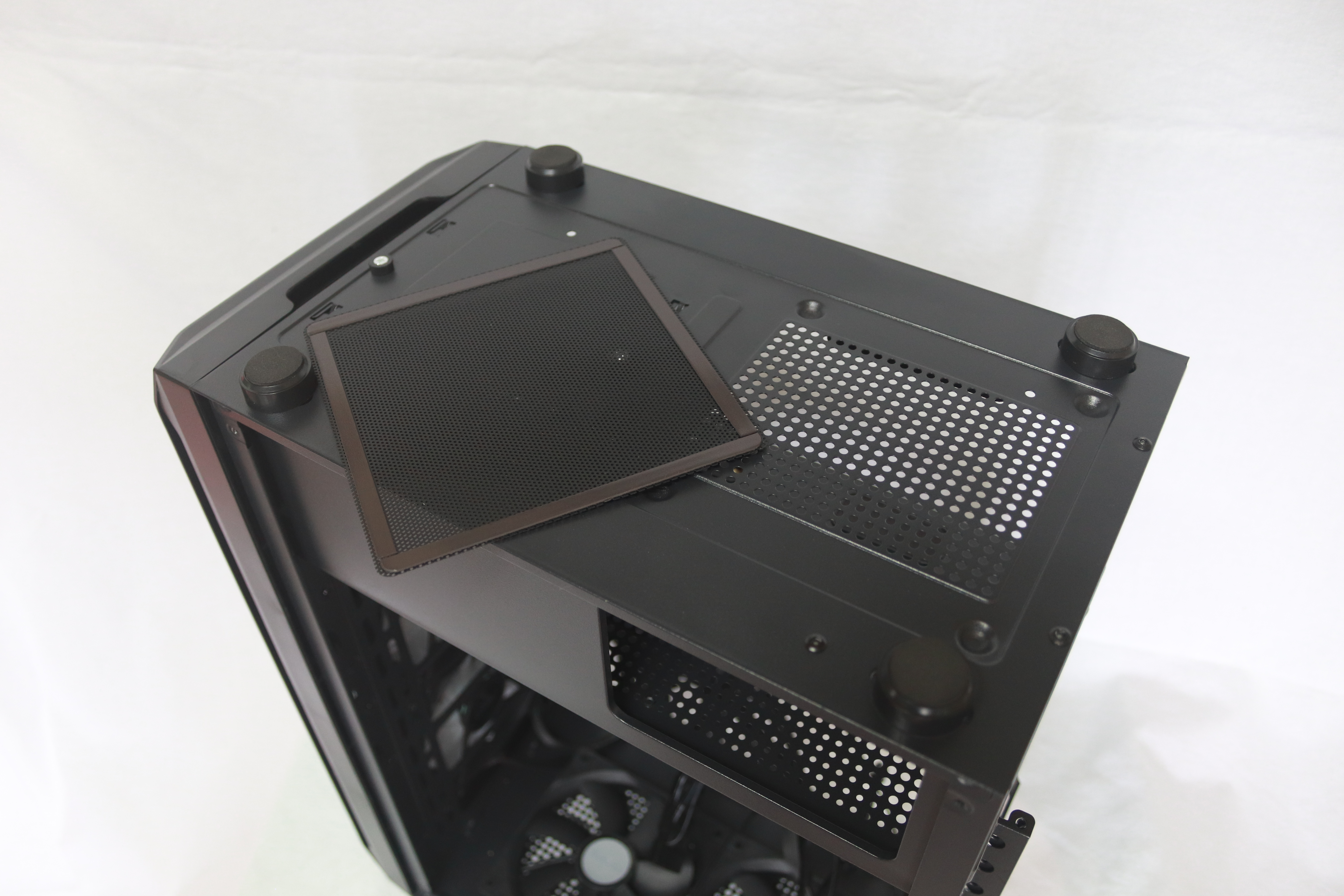 하단에는 요즘 트렌드에 맞게 하단 파워 서플라이 가림막이 기본적으로 장착되어 있어 선정리시 깔끔함을 추구 할 수 있게 해준다. 또한 상단이 타공이 되어 있어 추가적인 120mm팬 2개를 장착할 수 있어 더 높은 쿨링 효과를 기대할 수 있다.
