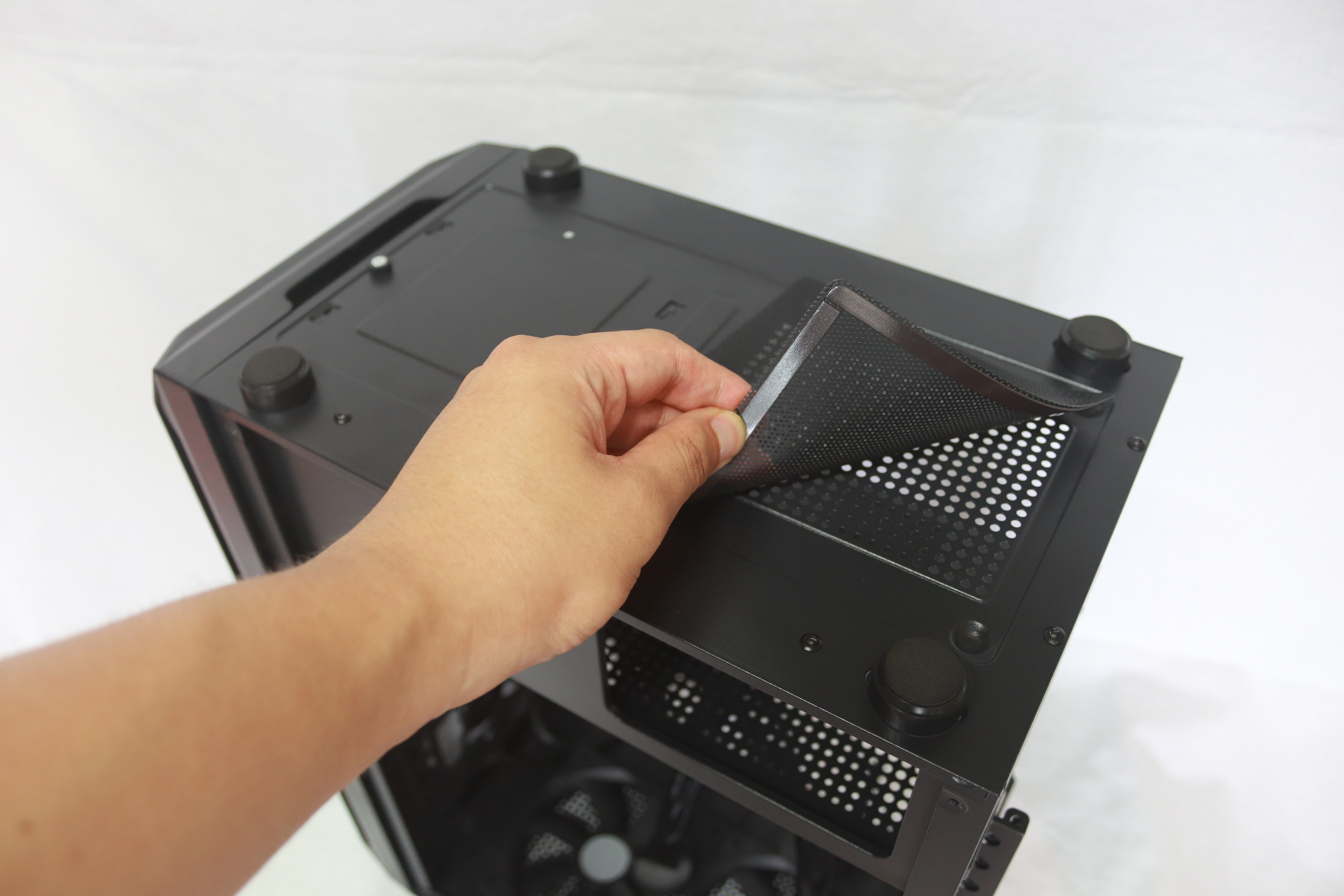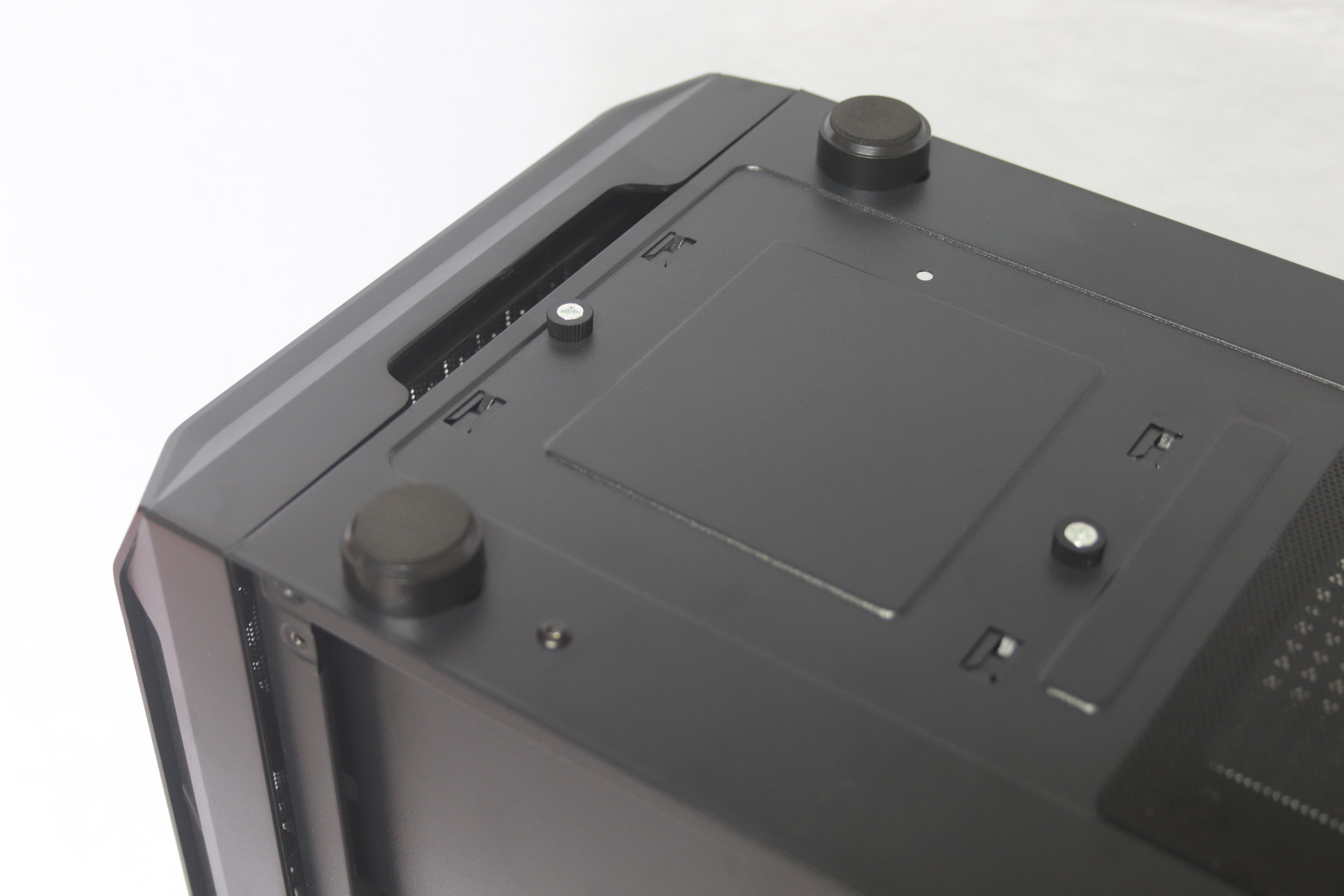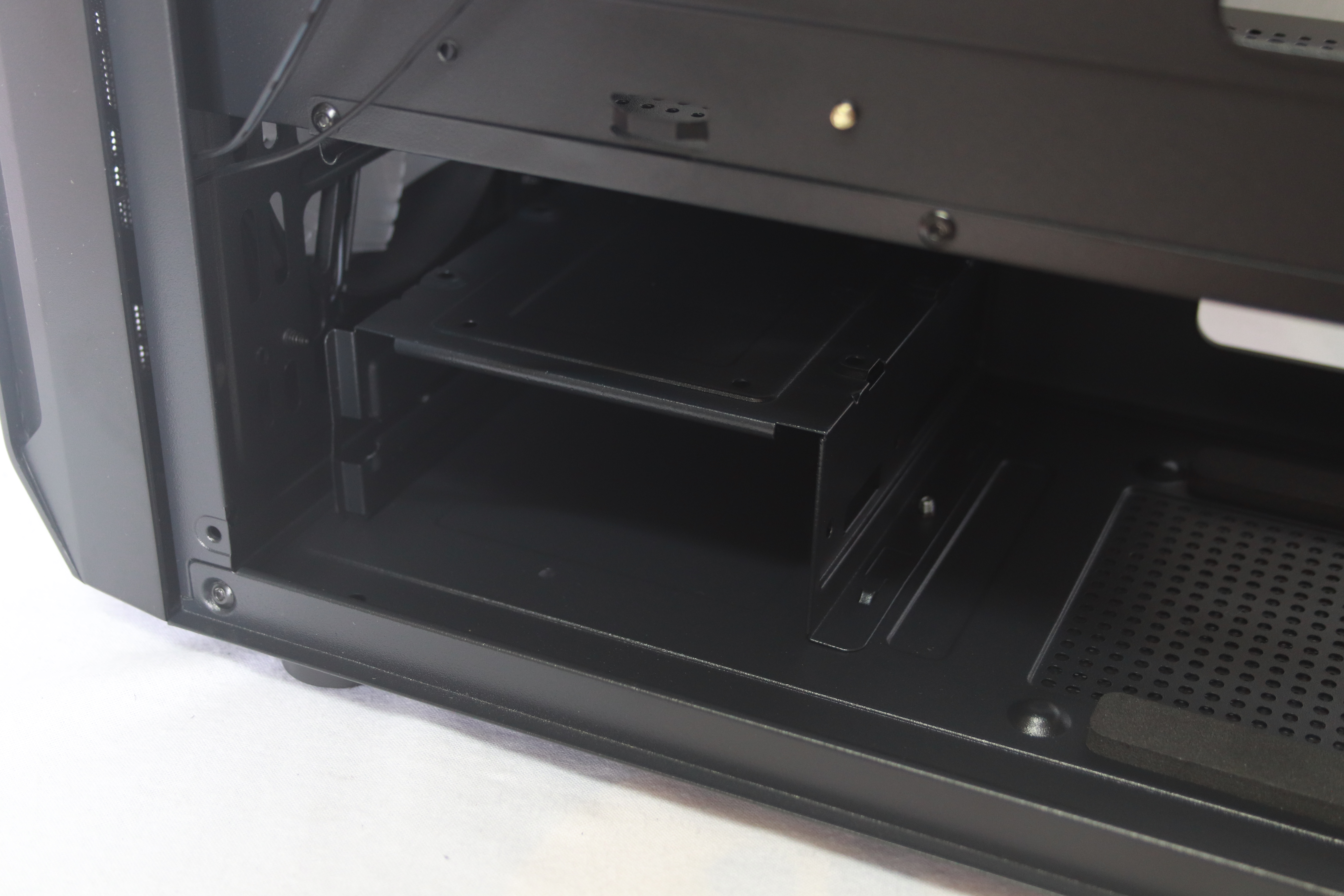 하단에는 요즘 트렌드에 맞게 하단 파워 서플라이 가림막이 기본적으로 장착되어 있어 선정리시 깔끔함을 추구 할 수 있게 해준다. 또한 상단이 타공이 되어 있어 추가적인 120mm팬 2개를 장착할 수 있어 더 높은 쿨링 효과를 기대할 수 있다.