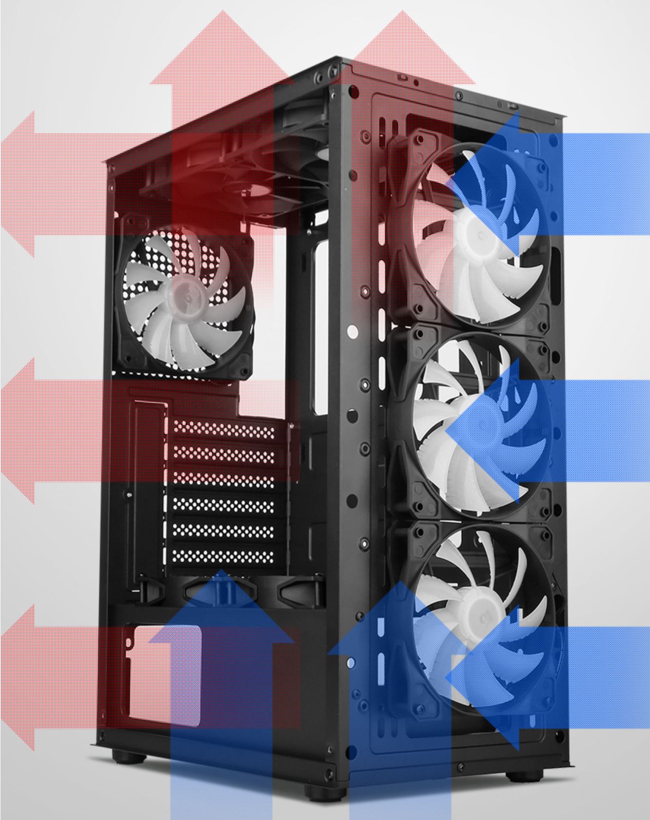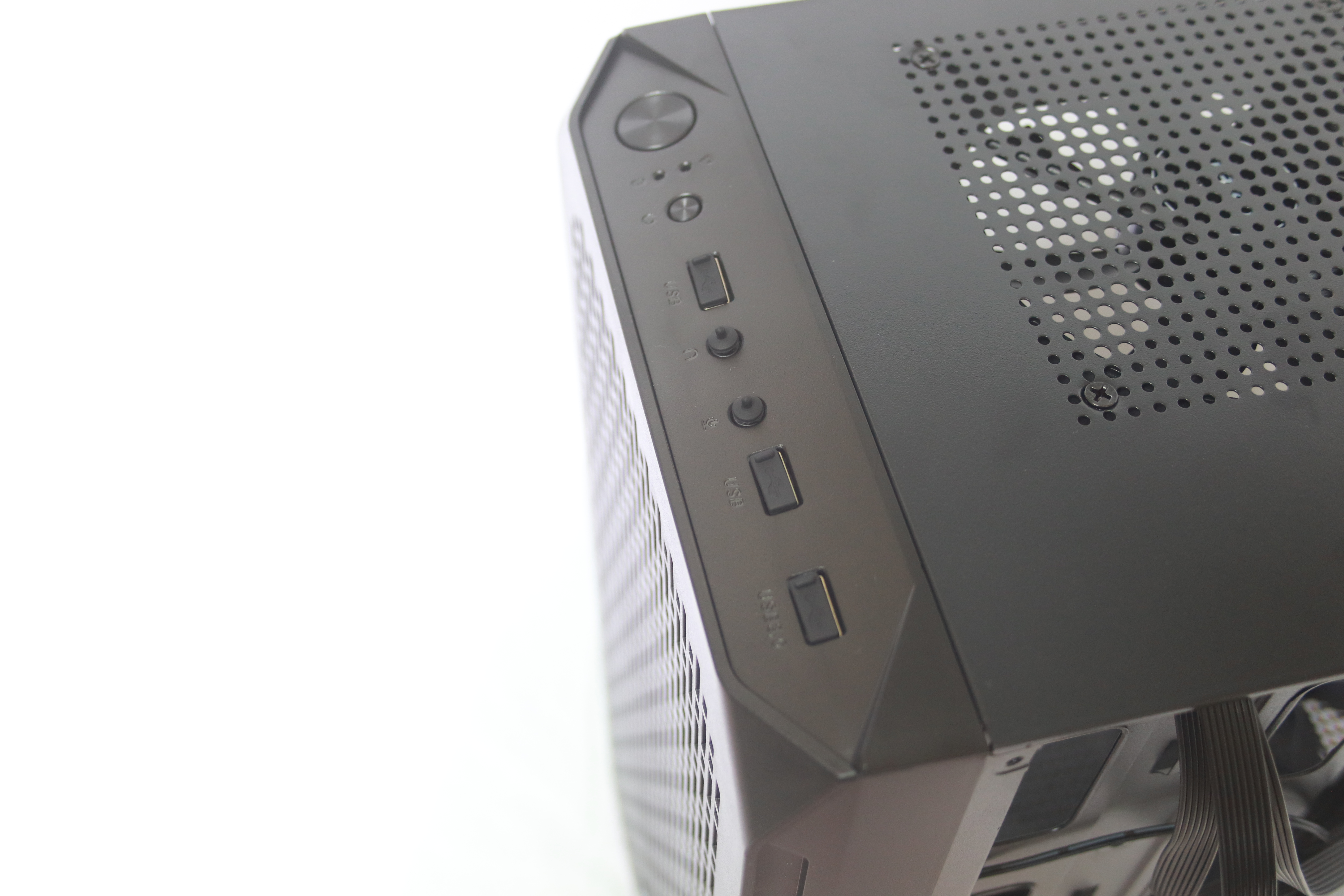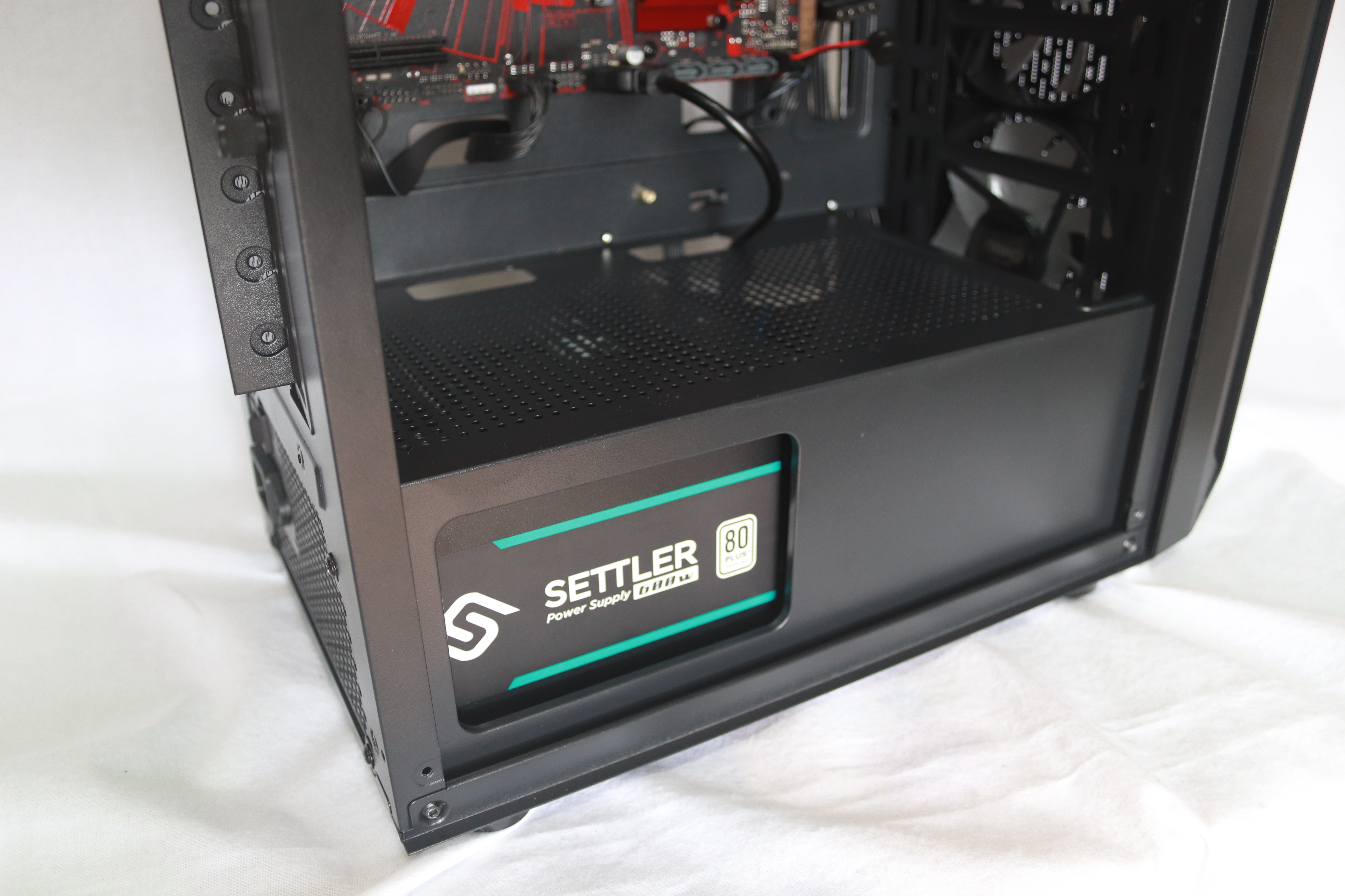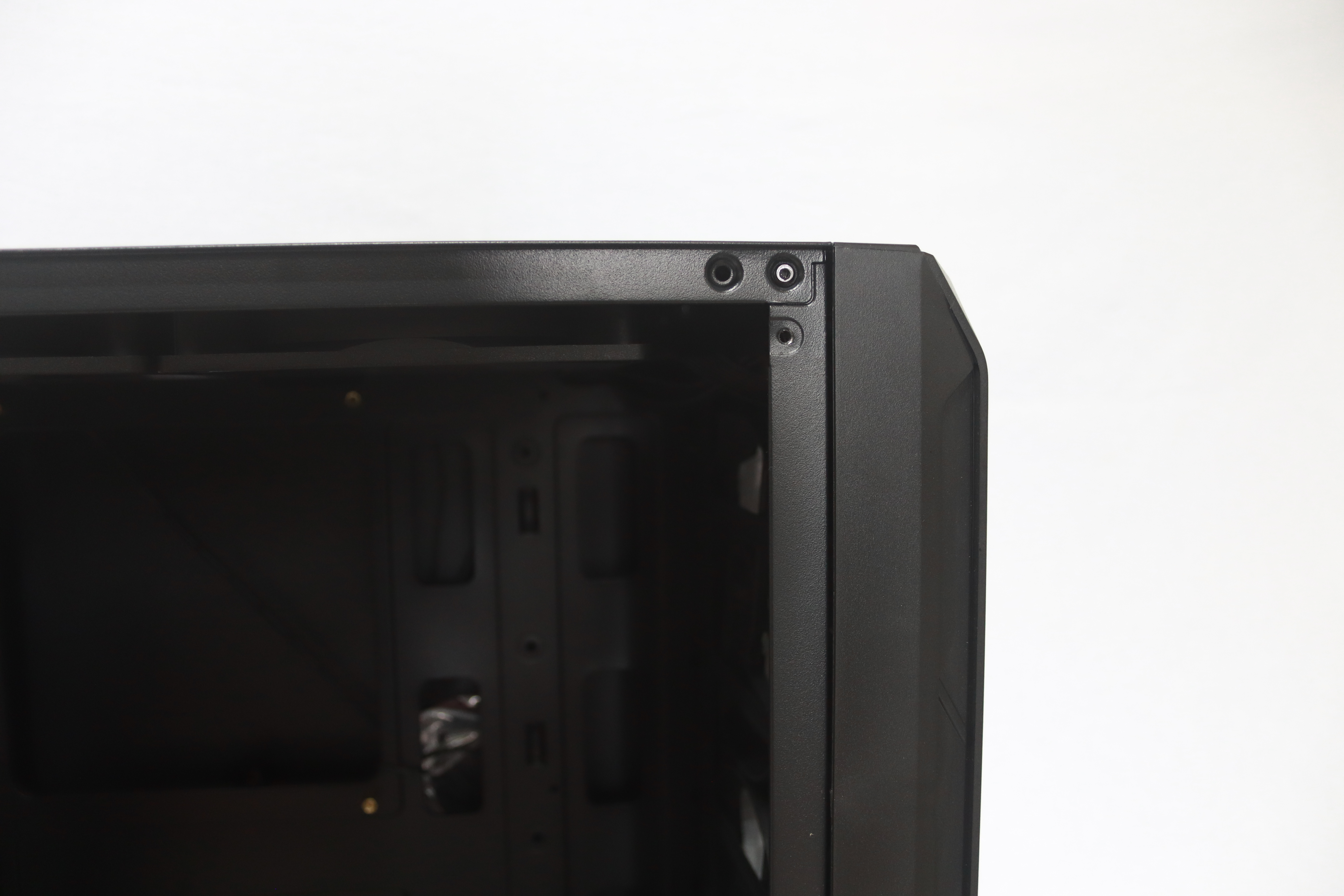 하단에는 요즘 트렌드에 맞게 하단 파워 서플라이 가림막이 기본적으로 장착되어 있어 선정리시 깔끔함을 추구 할 수 있게 해준다. 또한 상단이 타공이 되어 있어 추가적인 120mm팬 2개를 장착할 수 있어 더 높은 쿨링 효과를 기대할 수 있다.