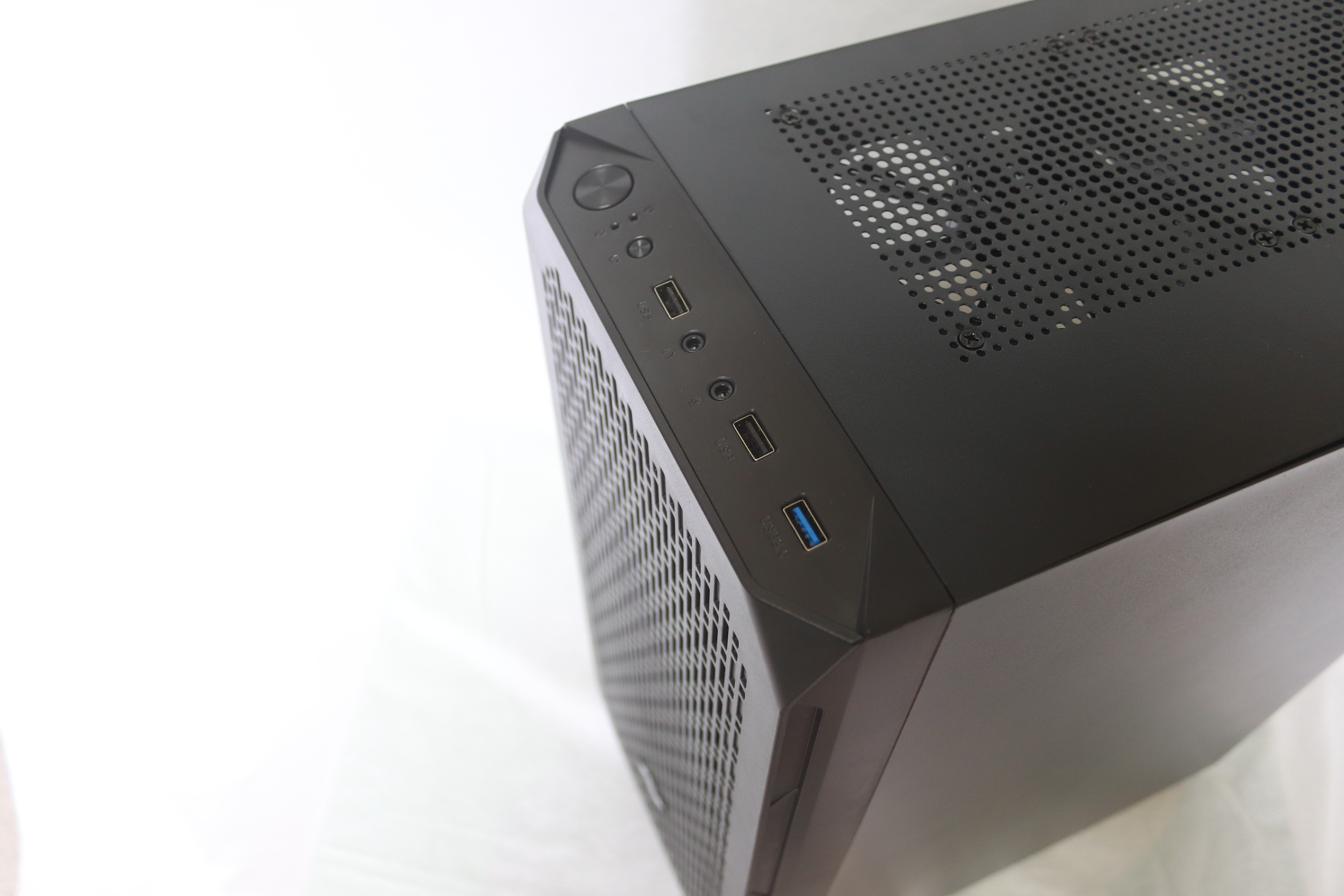 상단 멀티미디어 포트 디자인은 살짝 기울어진 형태의 디자인이며 전원 번튼, 리셋 버튼, USB 2.0 2개, USB 3.0 1개로 구성이 되어 있으며 HDD와 파워 LED 그리고 마이크, 헤드셋 포트가 있음을 확인 할 수 있다.