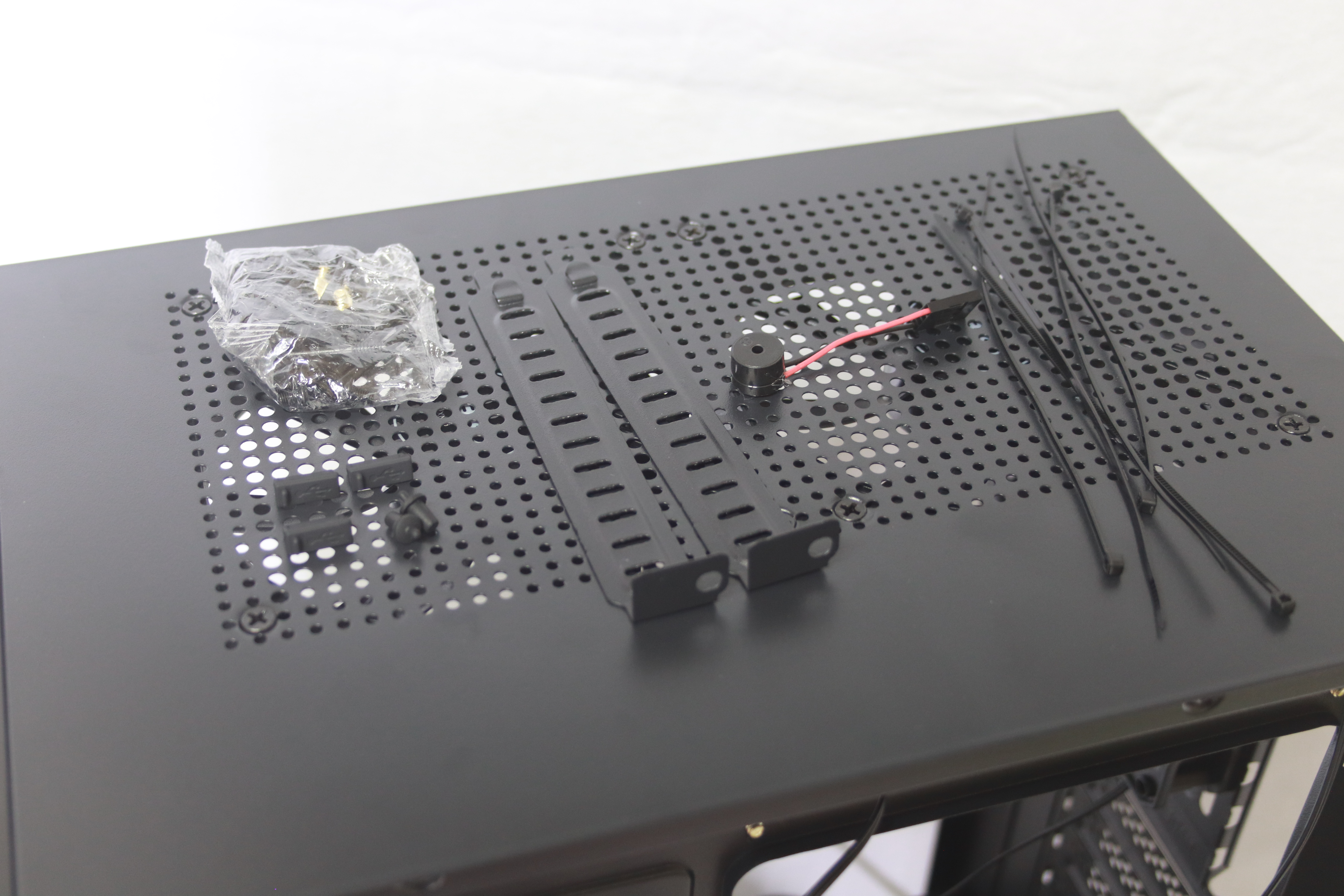 부속품으로 제공되는 것은 케이블 타이와 재사용이 가능한 PCI슬롯 2개, 비프음 단자, 각종 스크류들, 상단 멀티 미디어 포트 먼지 유입방지 고무커버들이 제공된다