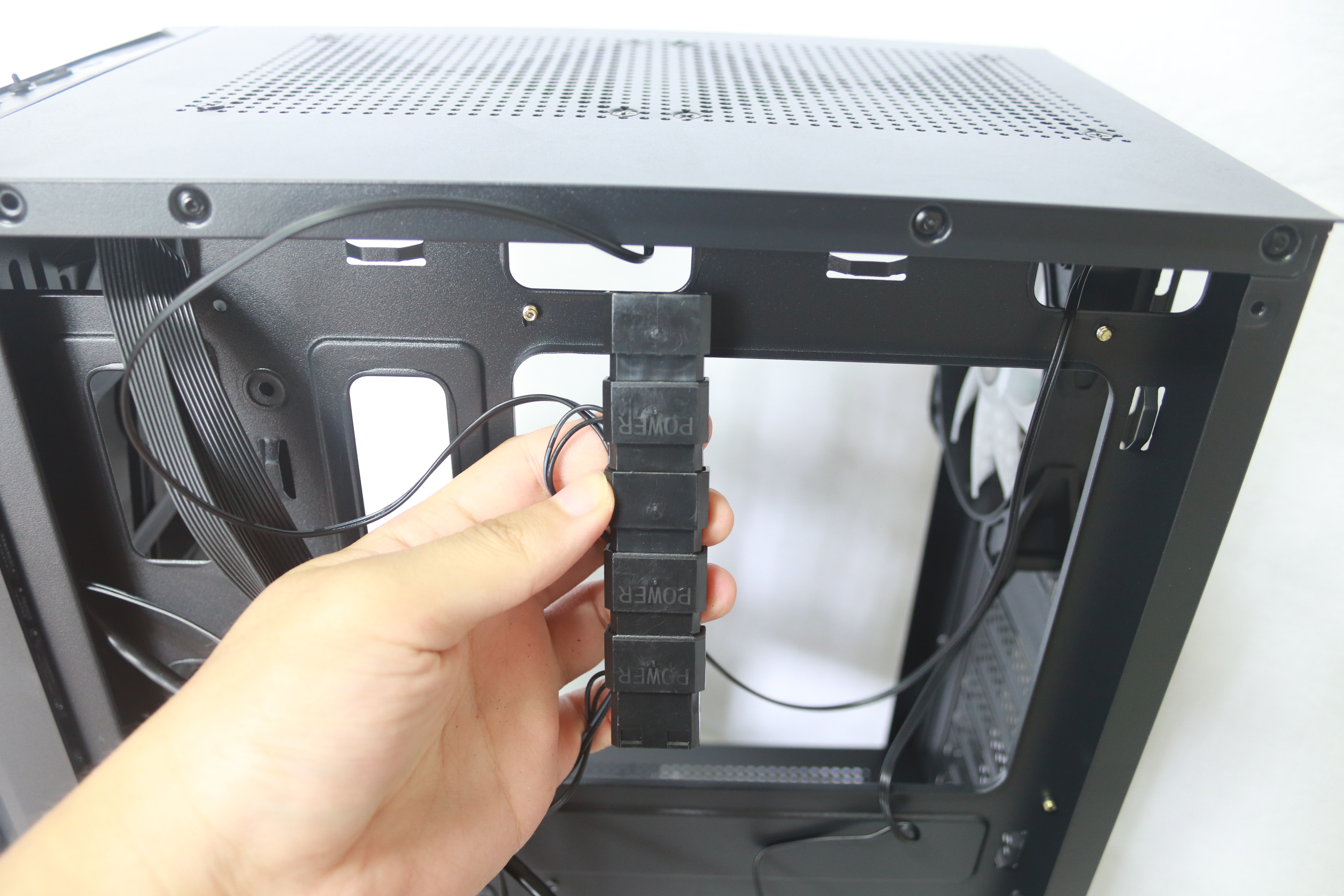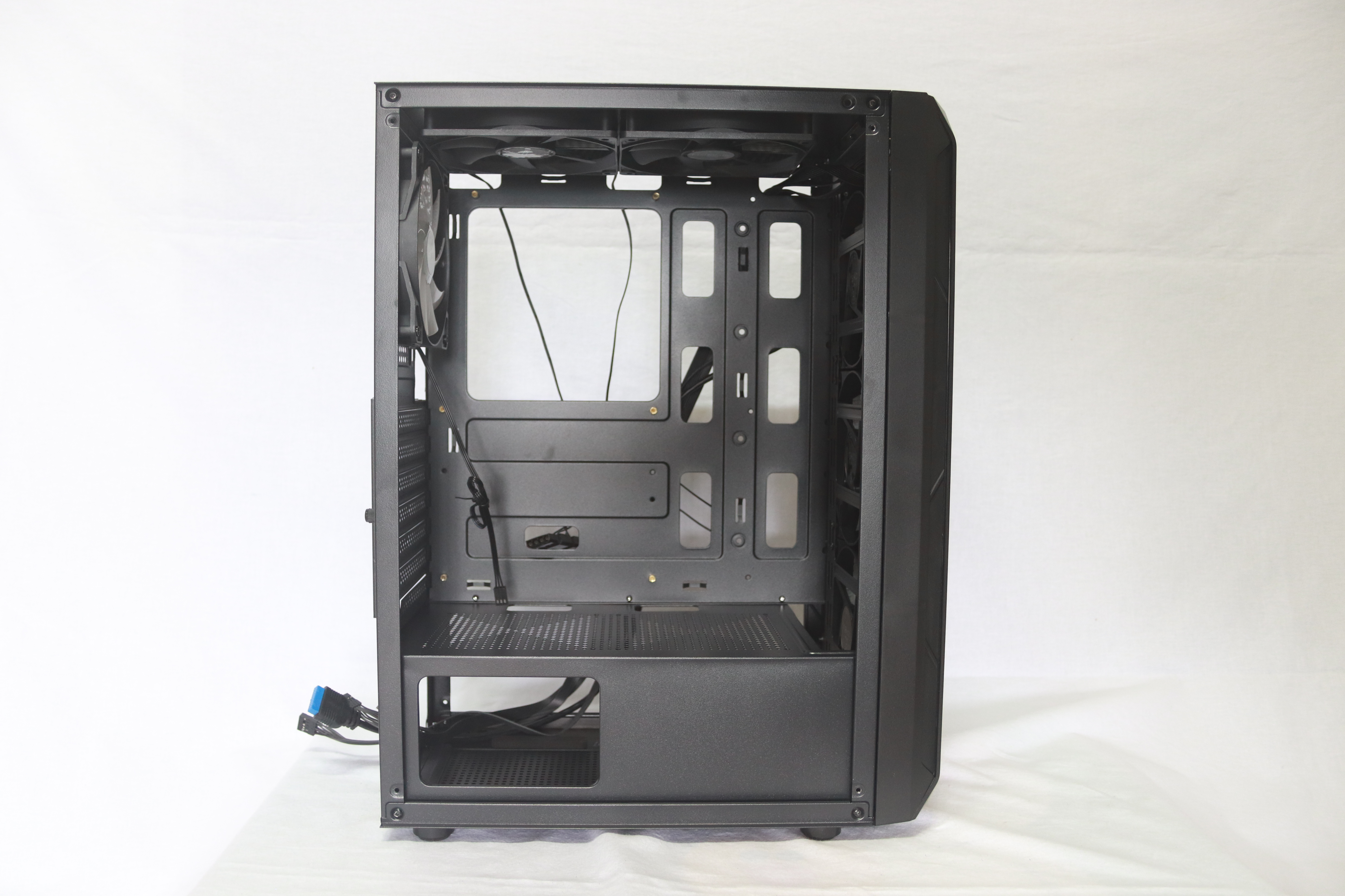 레인인보우 LED 팬 3개를 확인할 수 있으며 선정리 홀들이 크게 뚫여 있어 선 정리에 충분히 잘 될 것으로 생각이 된다.