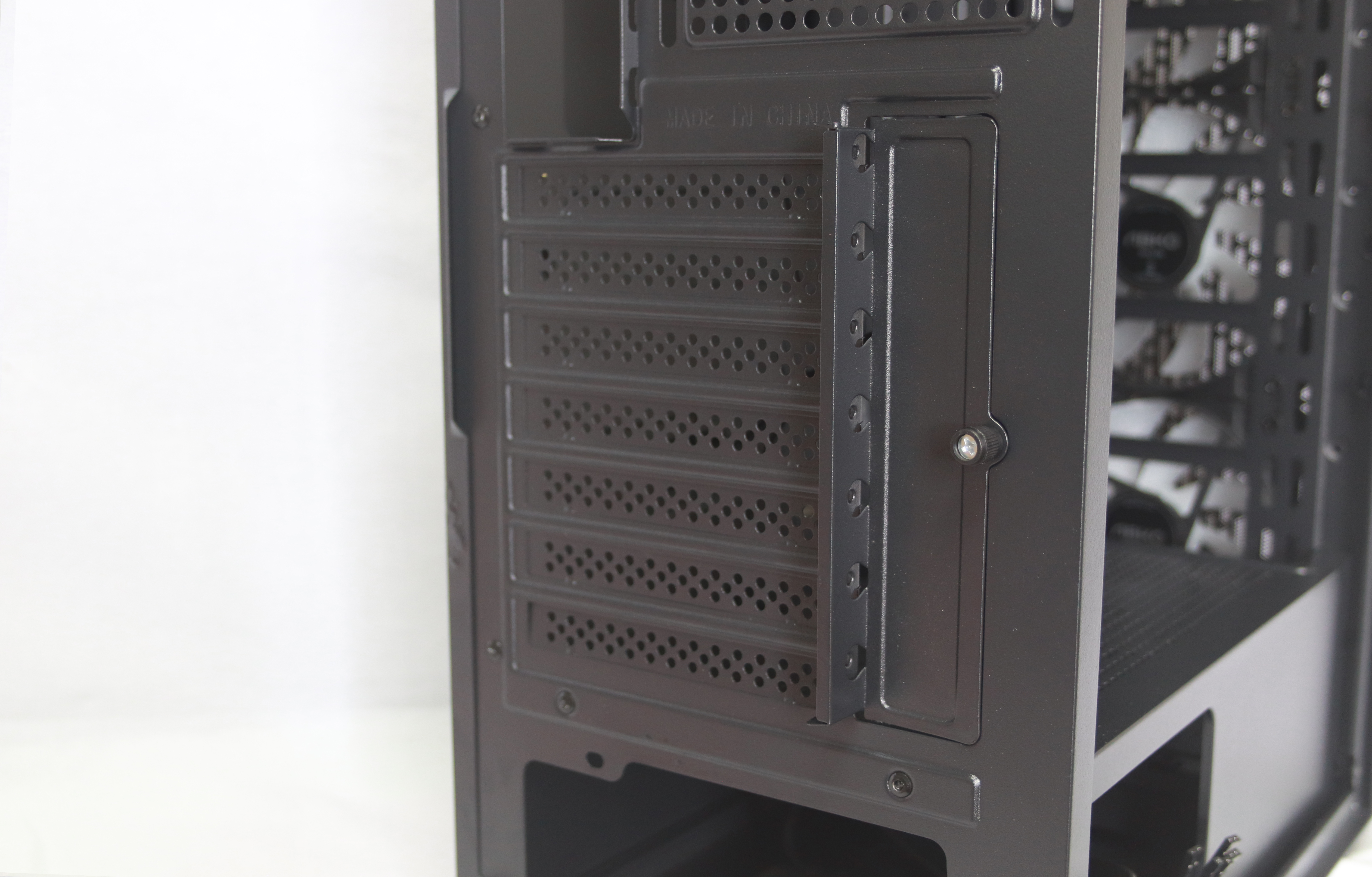 후면 부분은 일반적인 미들 케이스의 형태를 취하는데 PCI슬롯 가이드와 함께 PCI슬롯은 총 7개 세트를 제공하며 재사용이 불가능하지만 재사용 가능한 커버 2개를 부속품으로 제공해주어 비어진 곳을 바라볼 일은 없을 듯하다.