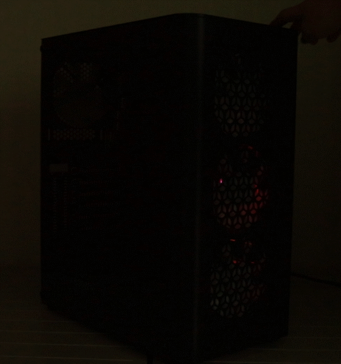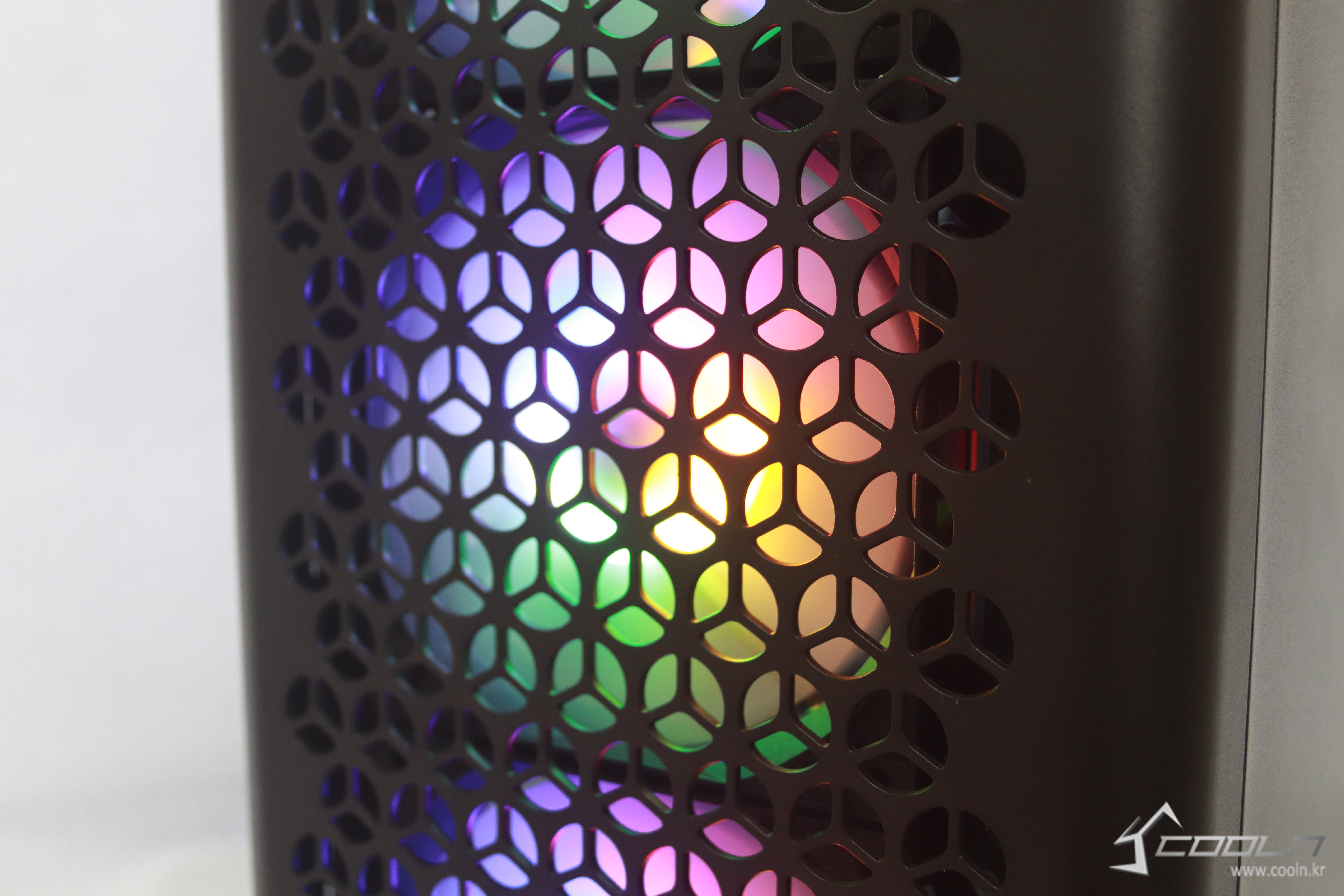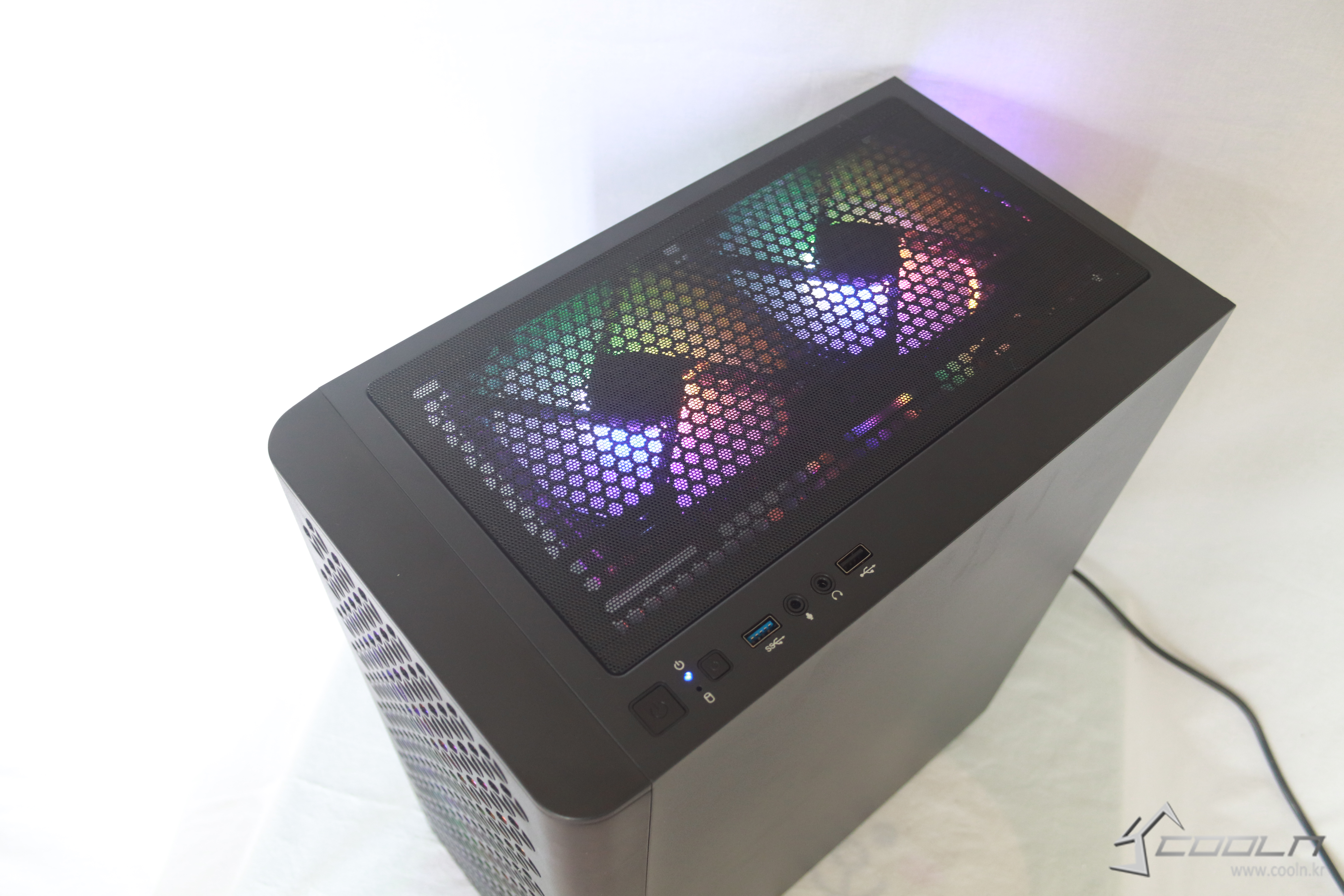 상단 역시 위쪽에서 보면 120mm 레인보우 LED팬이 보여 상당히 깔끔하면서 흔히 말하는 RGB감성을 느낄 수 있다.