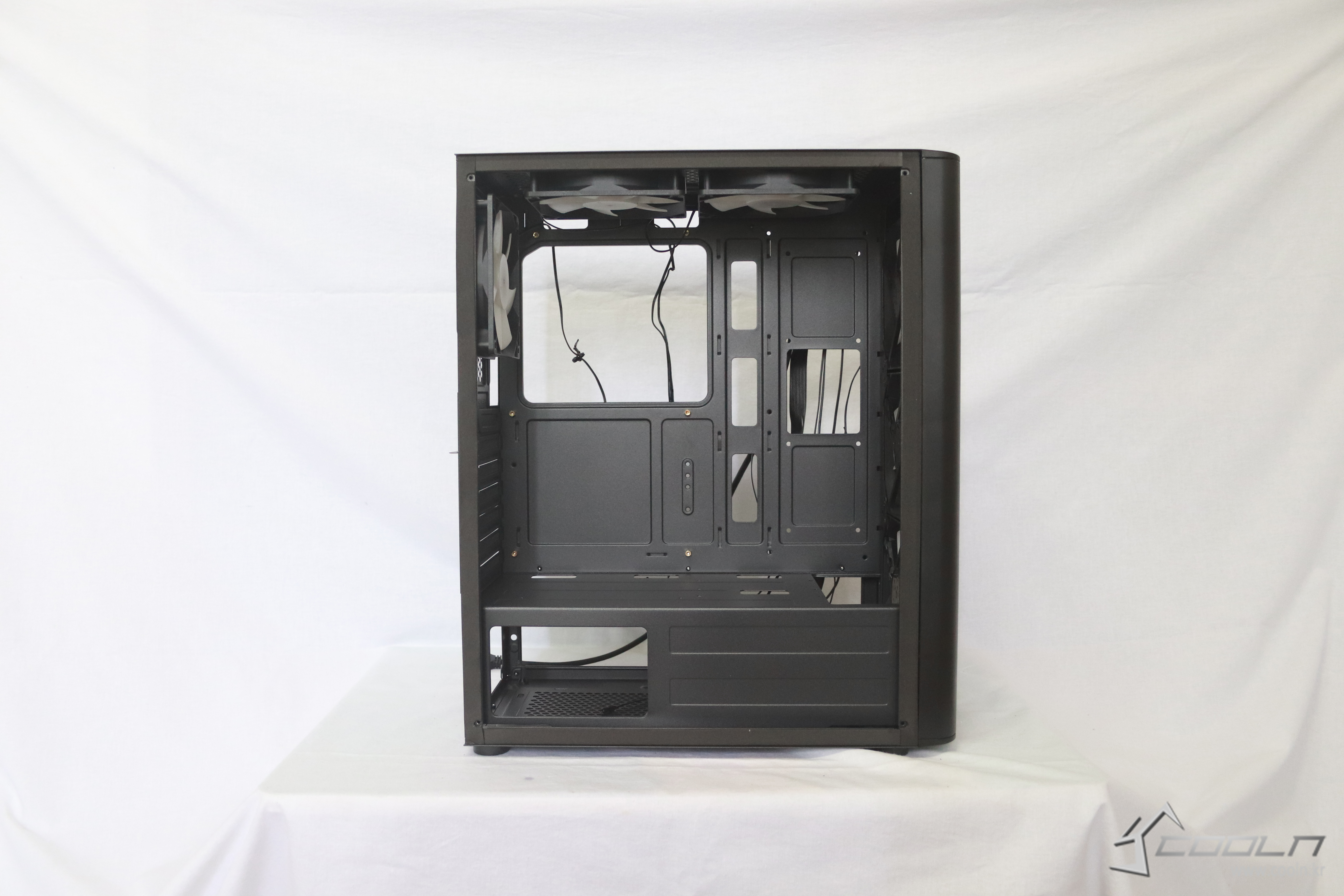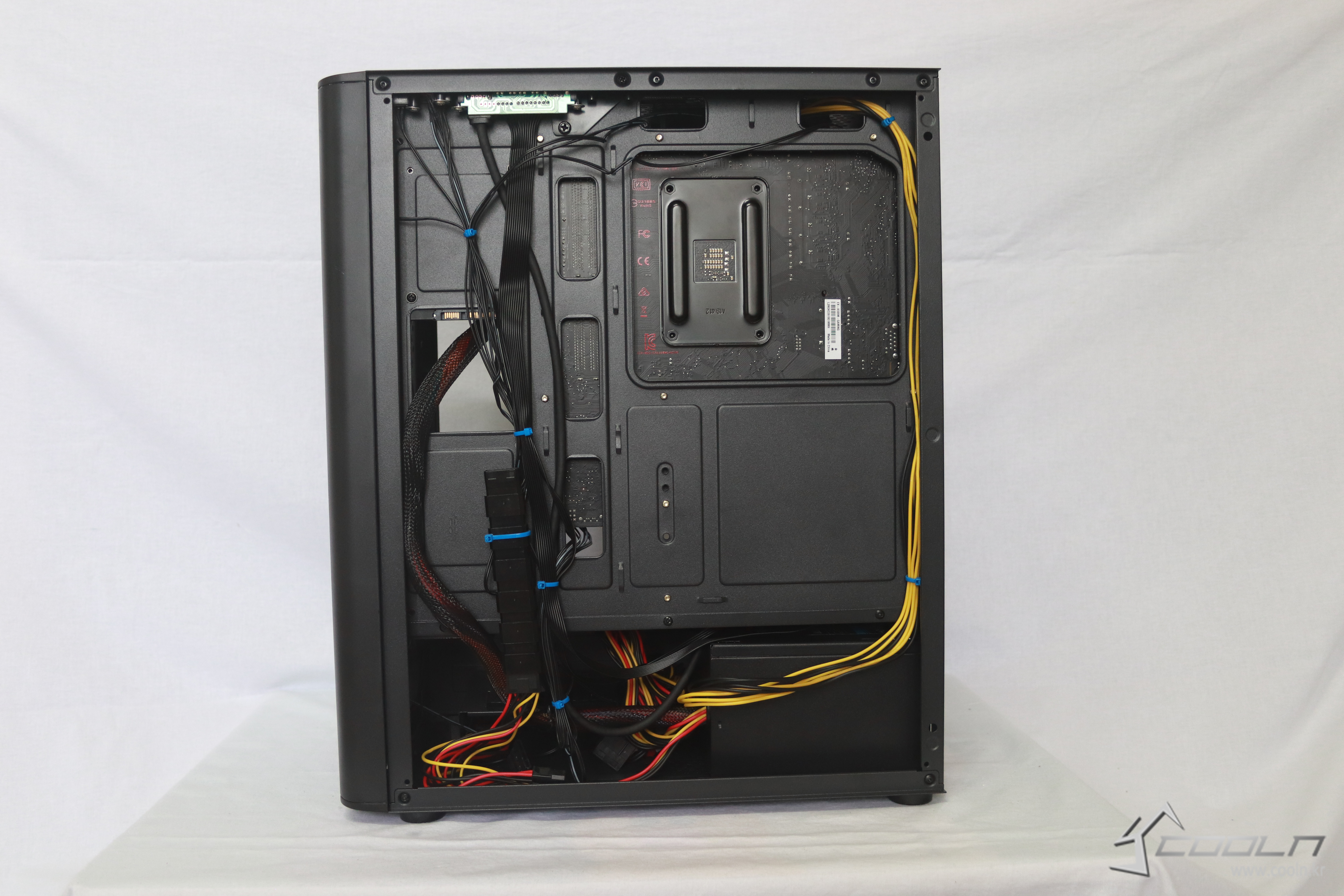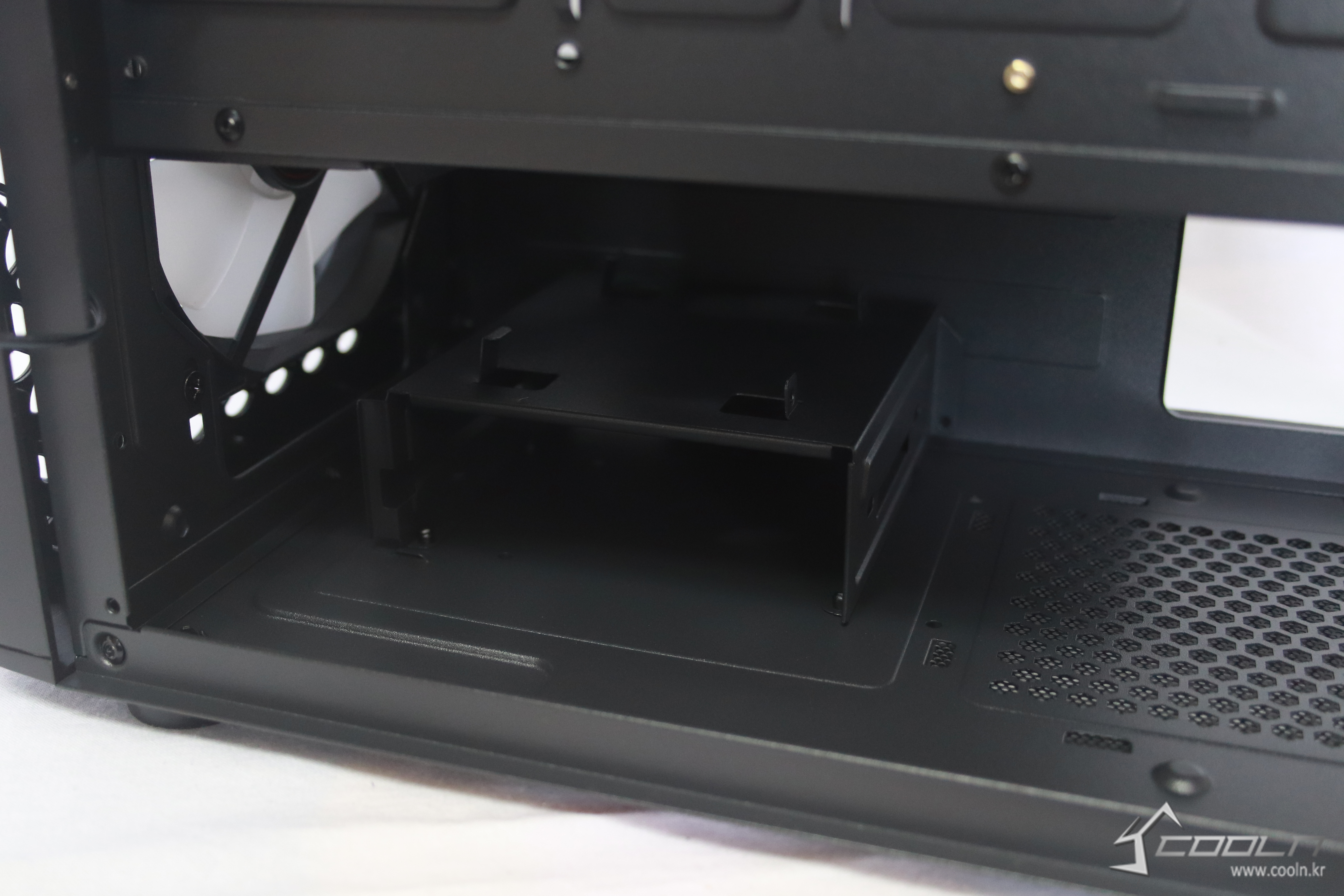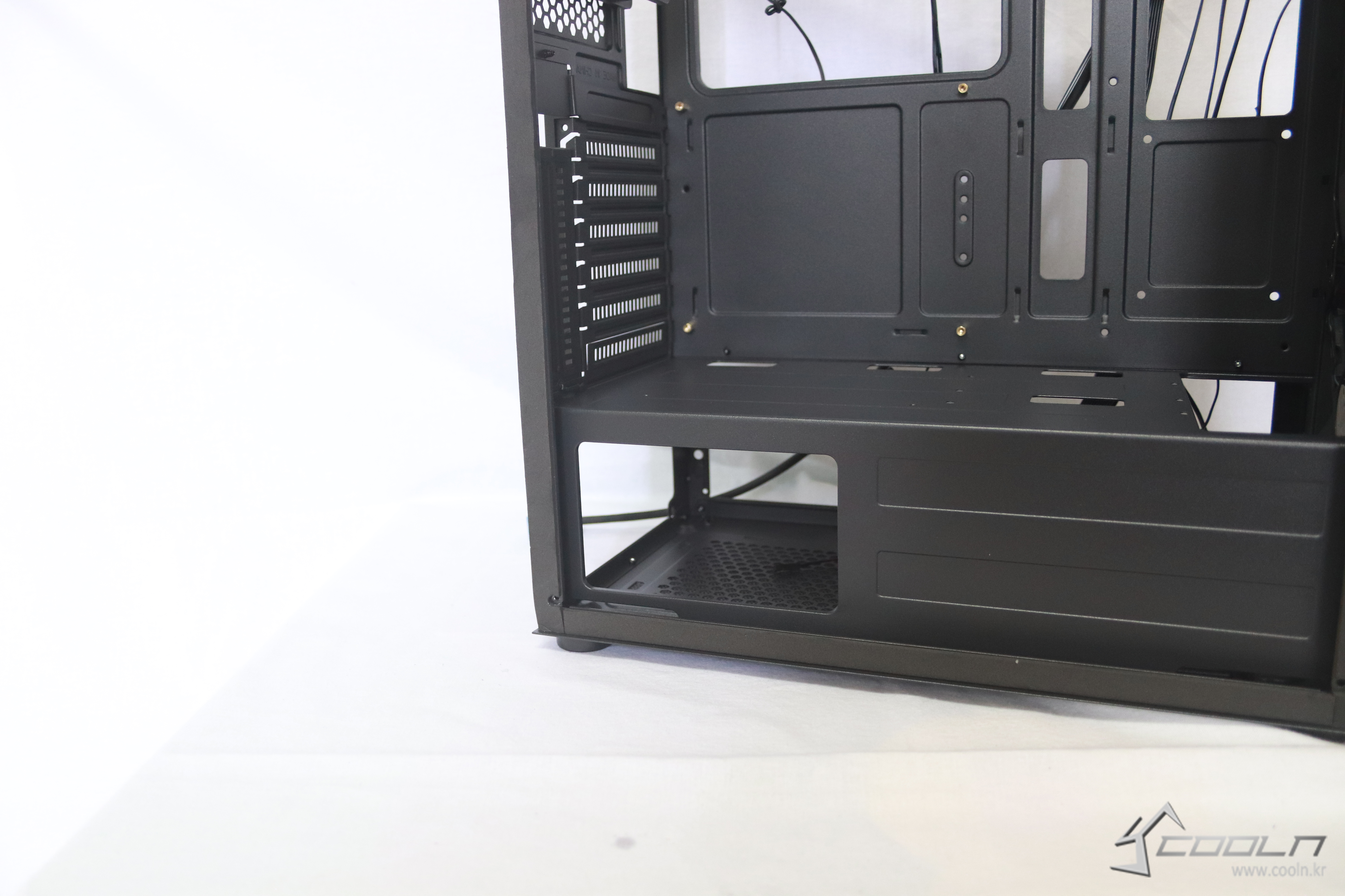 하단에는 요즘 트렌드인 깔끔함을 위해 파워 서플라이 가림막이 있어 선정리가 훨씬더 편해졌으며 파워 플레이트를 노출 시켜줄 컷팅홀이 존재한다.
