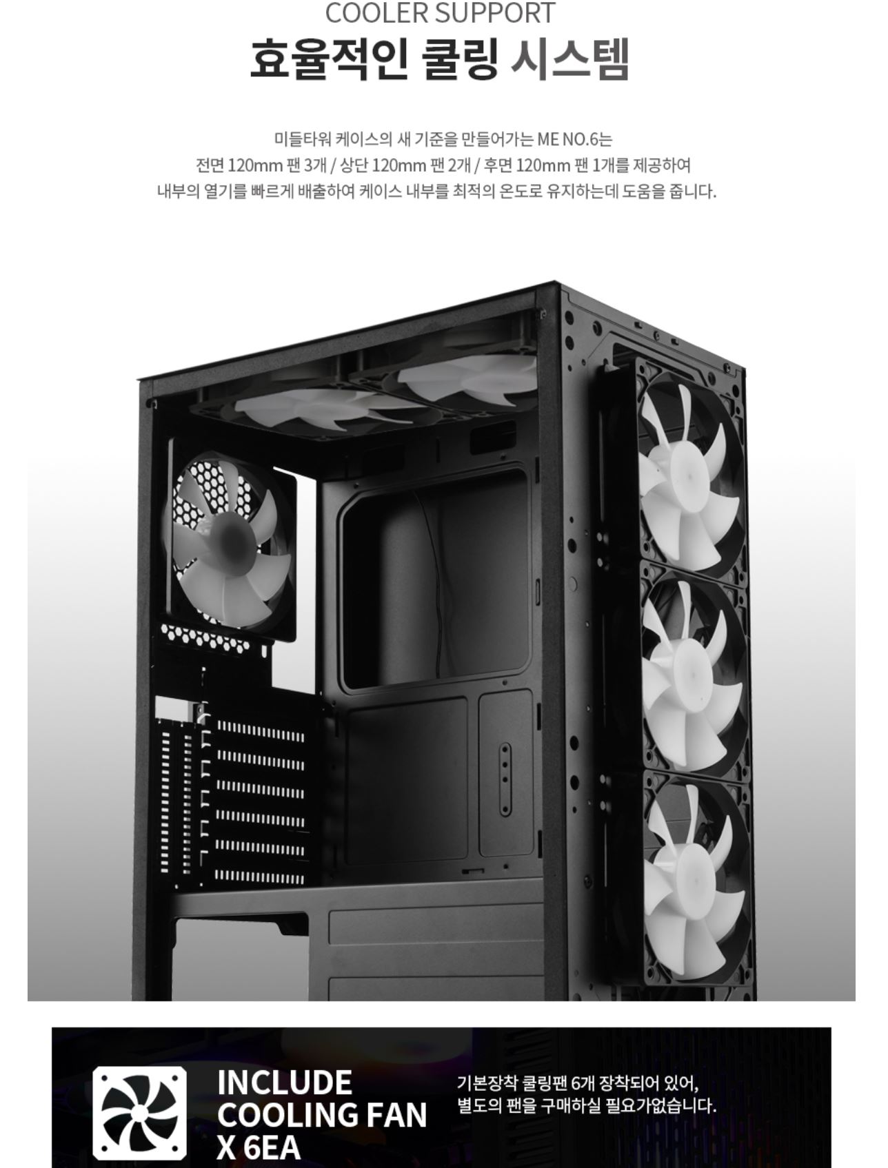 CPU및 그래픽 카드들 사양이 높아지고 가격대가 낮아지게 되면서 일반 사용자들도 발열이 높은 시스템을 구성할 가능성이 높아지면서 케이스에도 점점 쿨링에 대한 중요성이 대두되어 오기 시작했다. 이전에는 하이엔드 사용자가 아니라면 크게 신경쓰지 않았다라고 한다면 요즘은 보급형 제품들 역시 사양이 높고 발열이 일정 있다보니 발열 관리를 신경쓰지 않을 수가 없게되었다. 그런 면에서 보급형 케이스들 역시 발열을 잡기위해 팬을 6개를 기본으로 장착하기 시작하기 시작했다. 그리고 대양케이스에서 나온 ME NO.6 RGB 풀 아크릴은 기본 팬 6개에 심지어 모든 기본 팬이 RGB를 주는 정말 팬을 사면 케이스를 주는 느낌이 들 정도의 케이스가 되었다.