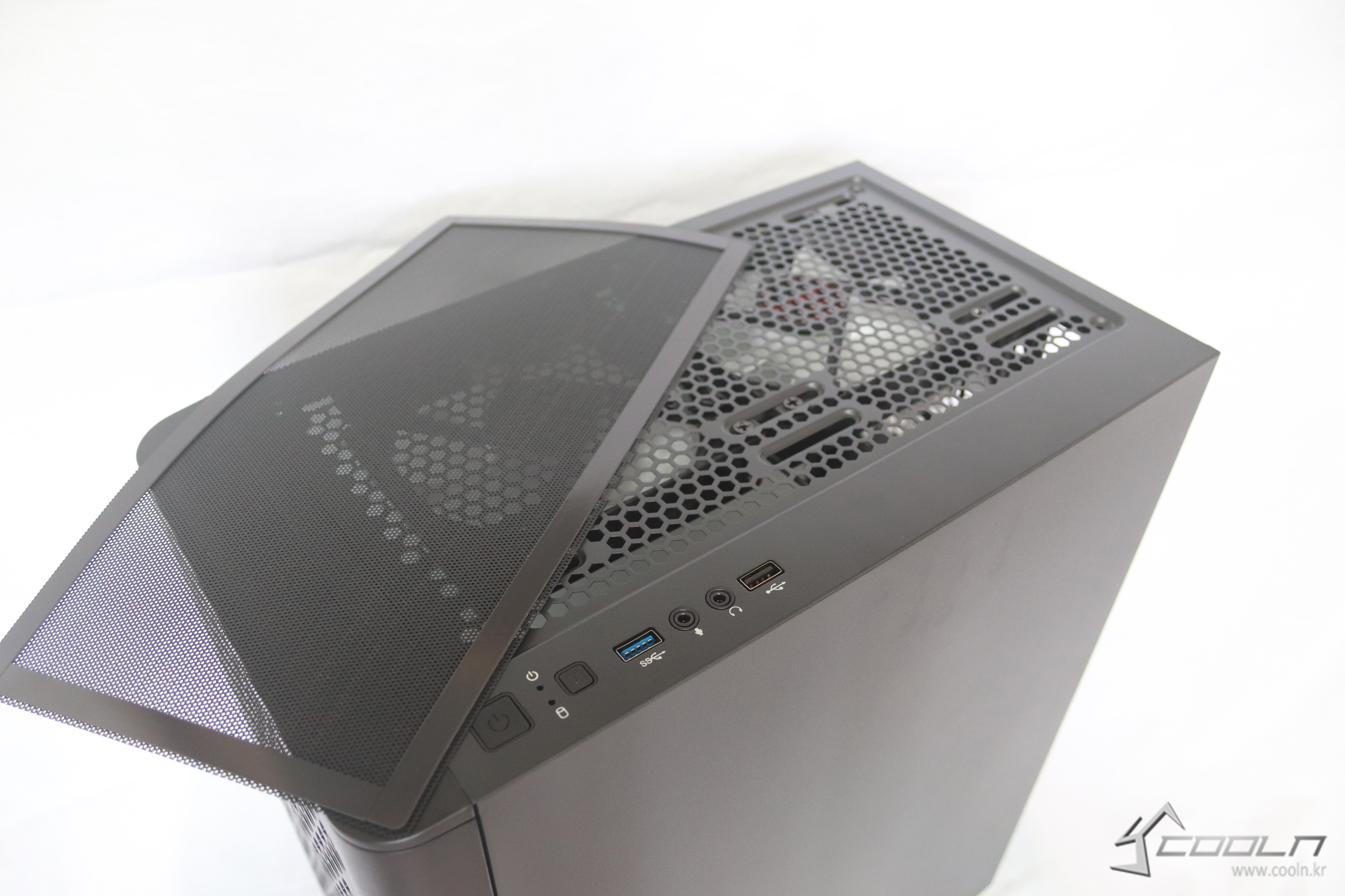 상단에는 기본 LED 120mm 팬이 있지만 140mm팬역시 달 수 있으며 하이엔드 쿨링을 위한 사용자들을 위해 120mm, 240mm, 280mm 규격의 라디에이터가 장착이 가능하다
