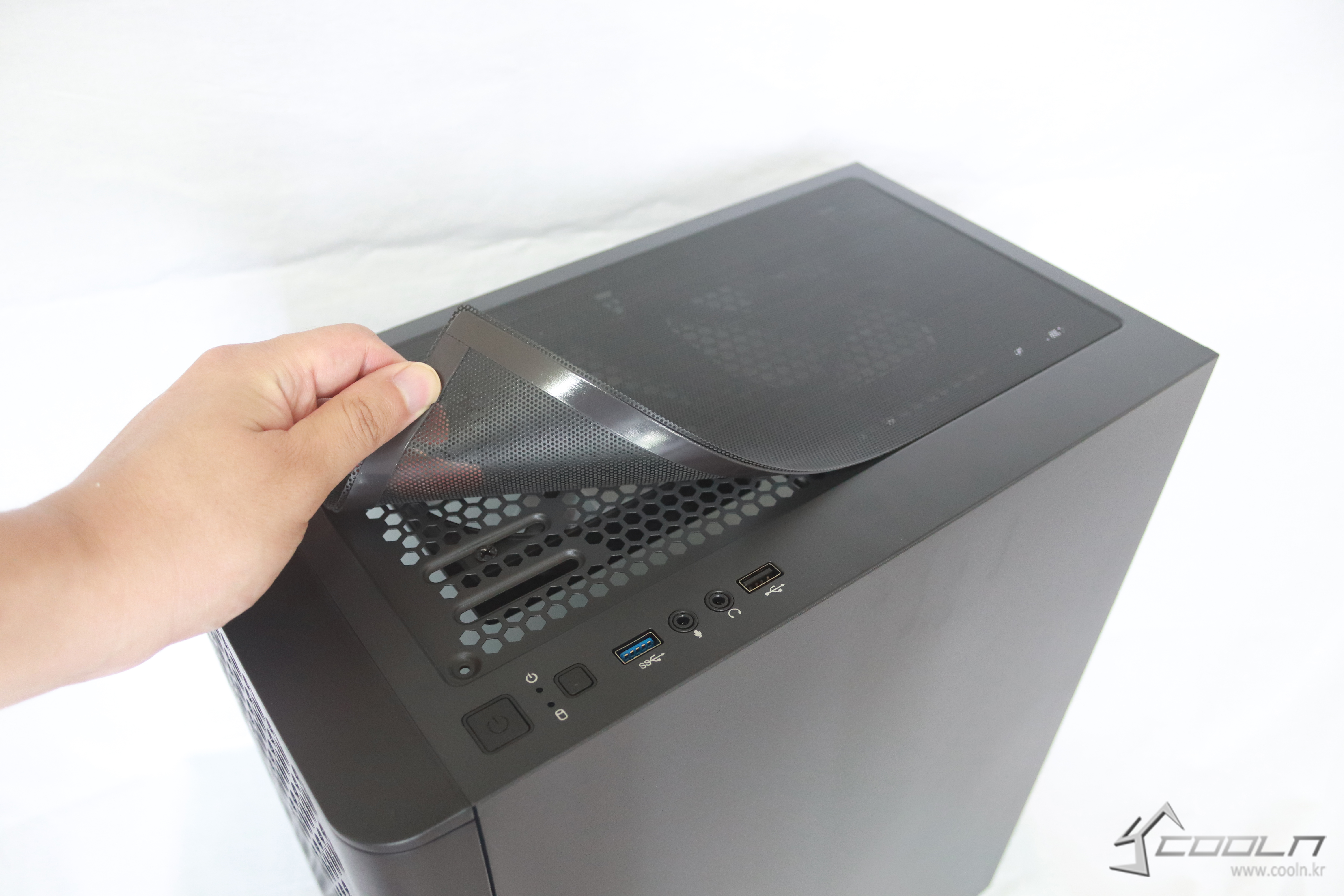 상단은 먼지 유입 방지해주는 마그넷으로 된 탈부착 가능한 먼지 필터로 구성이 되어 있다.