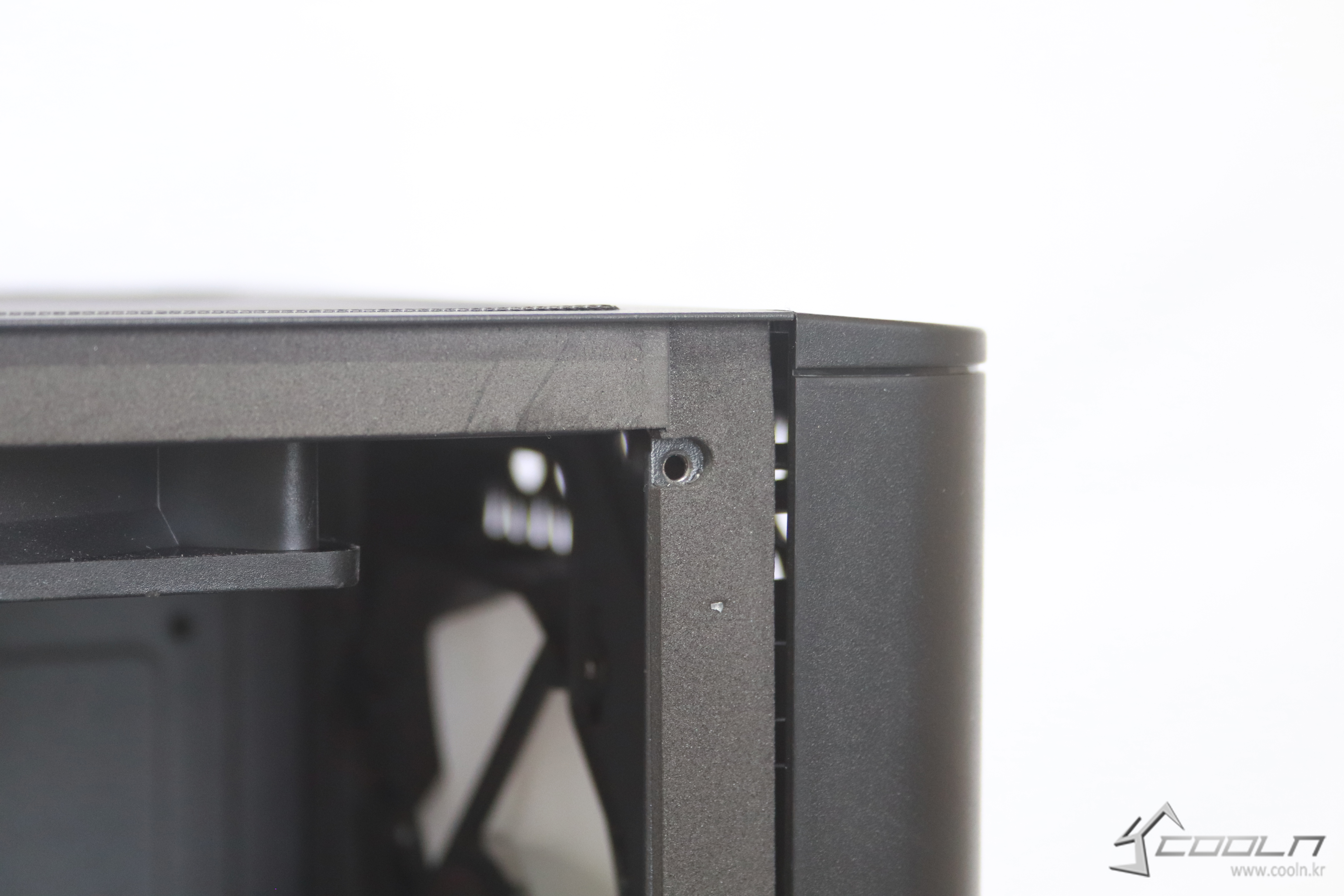 하단 파워 장착 시스템이며 파워 서플라이 가림막은 컷팅홀을 통해 파워 플레이트를 확인이 가능하다.
