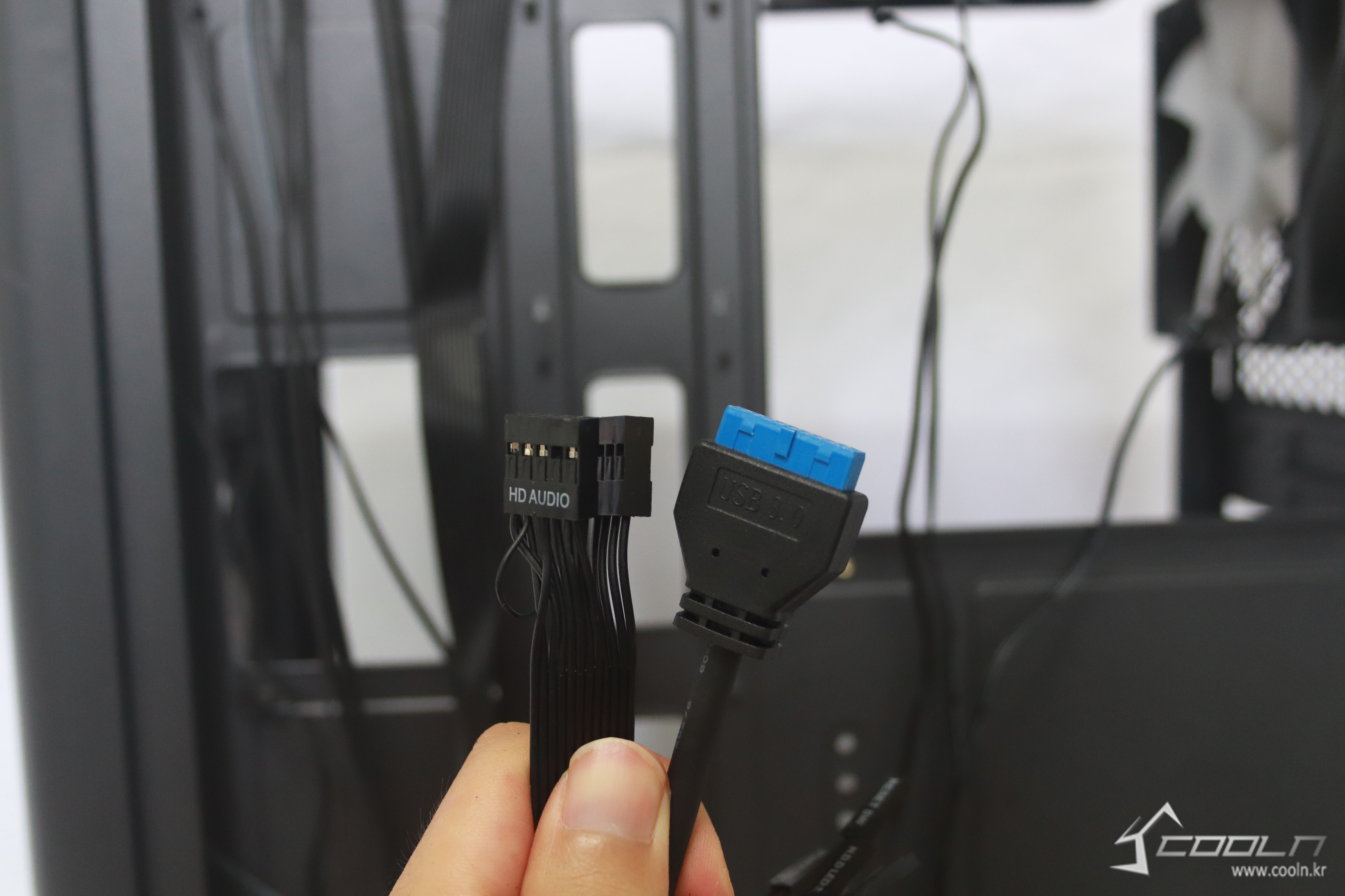기본으로 제공되는 4개의 팬은 IDE커넥터로 연결이 되어 있으며 별도의 팬 허브가 없어 속도 조절 및 LED 점등 혹은 변환은 불가능하다. USB 3.0, 2.0커넥터가 제공되면 이 가격대의 케이스에서 사용되는 전원 및 리셋 연결 커넥터를 확인 할 수 잇다.