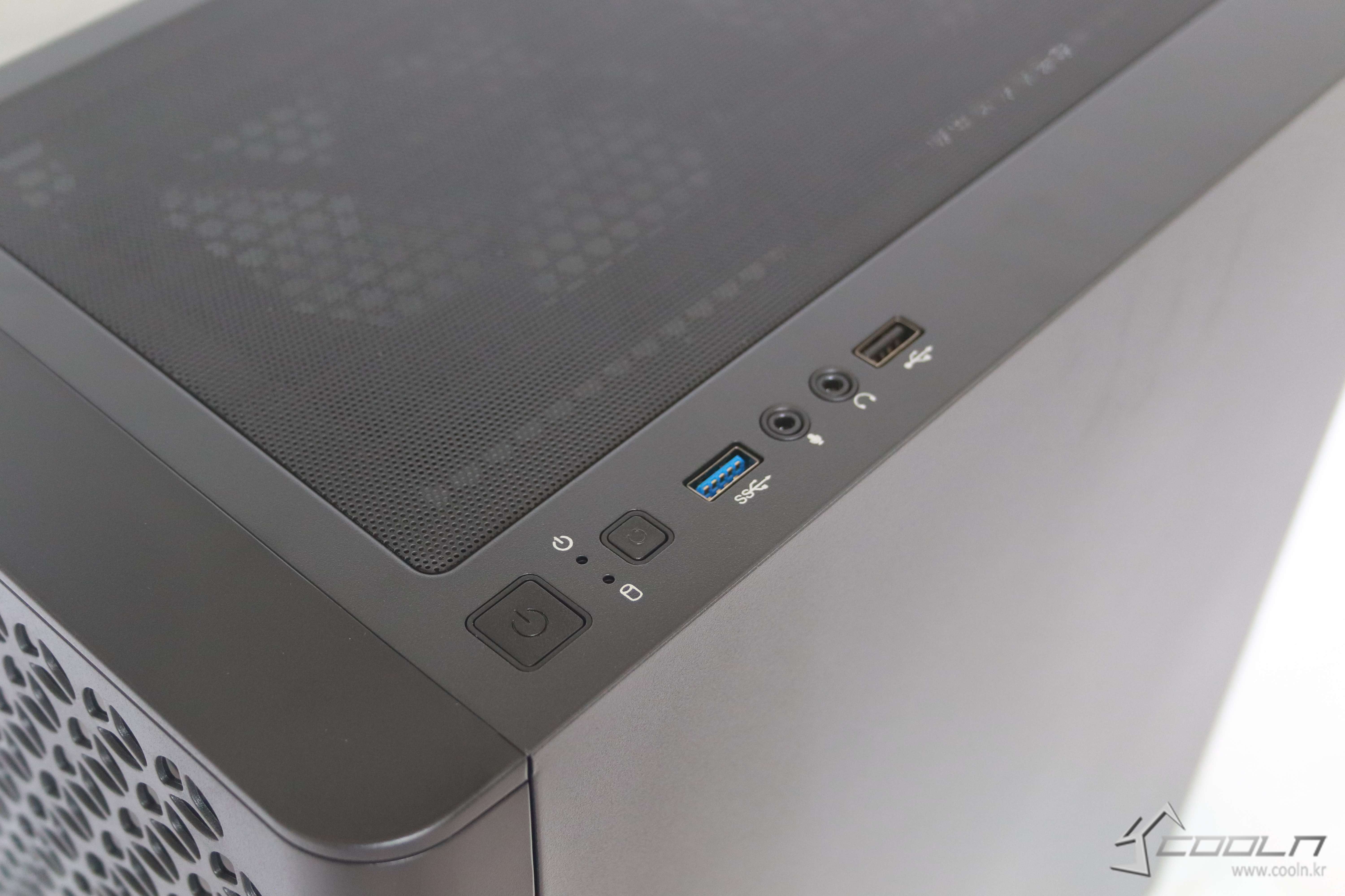 상단이 상당히 넓으며 상단 멀티 미디어 포트로 구성이 되어 있는데 독특하게도 사로가 아닌 세로형으로 구성이 되어있다. 멀티미이더 포트 구성으로는 전원버튼, 리셋 버튿, USB 3.01개와 USB 2.0 1개 HDD와 파워 LED 마이크, 이어셋 포트를 확인 할 수 있다.