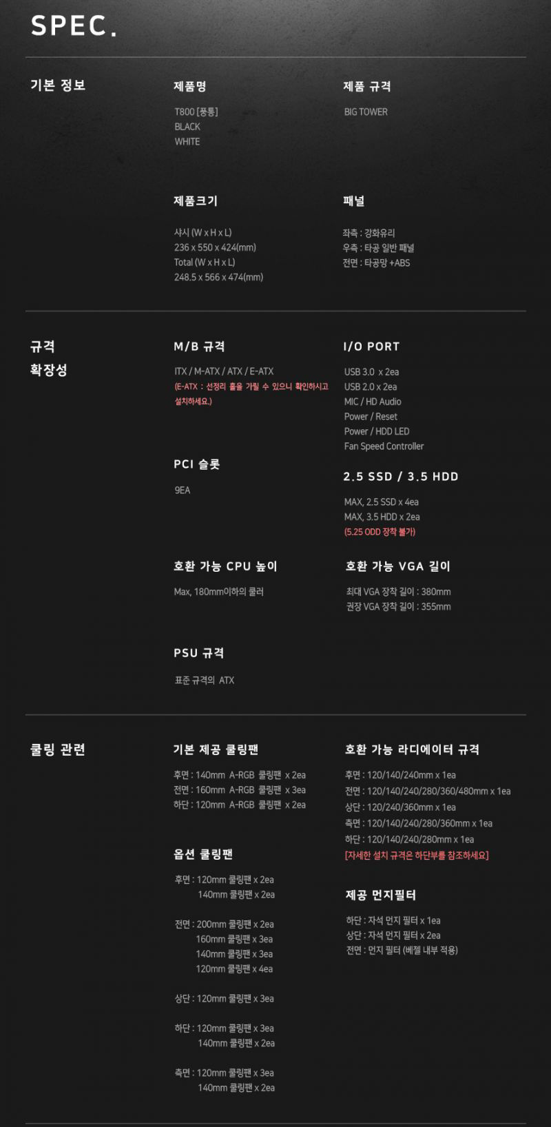 빅타워답게 다양한 크기의 메인보드, 파워, 라디에이터등을 지원을 하고