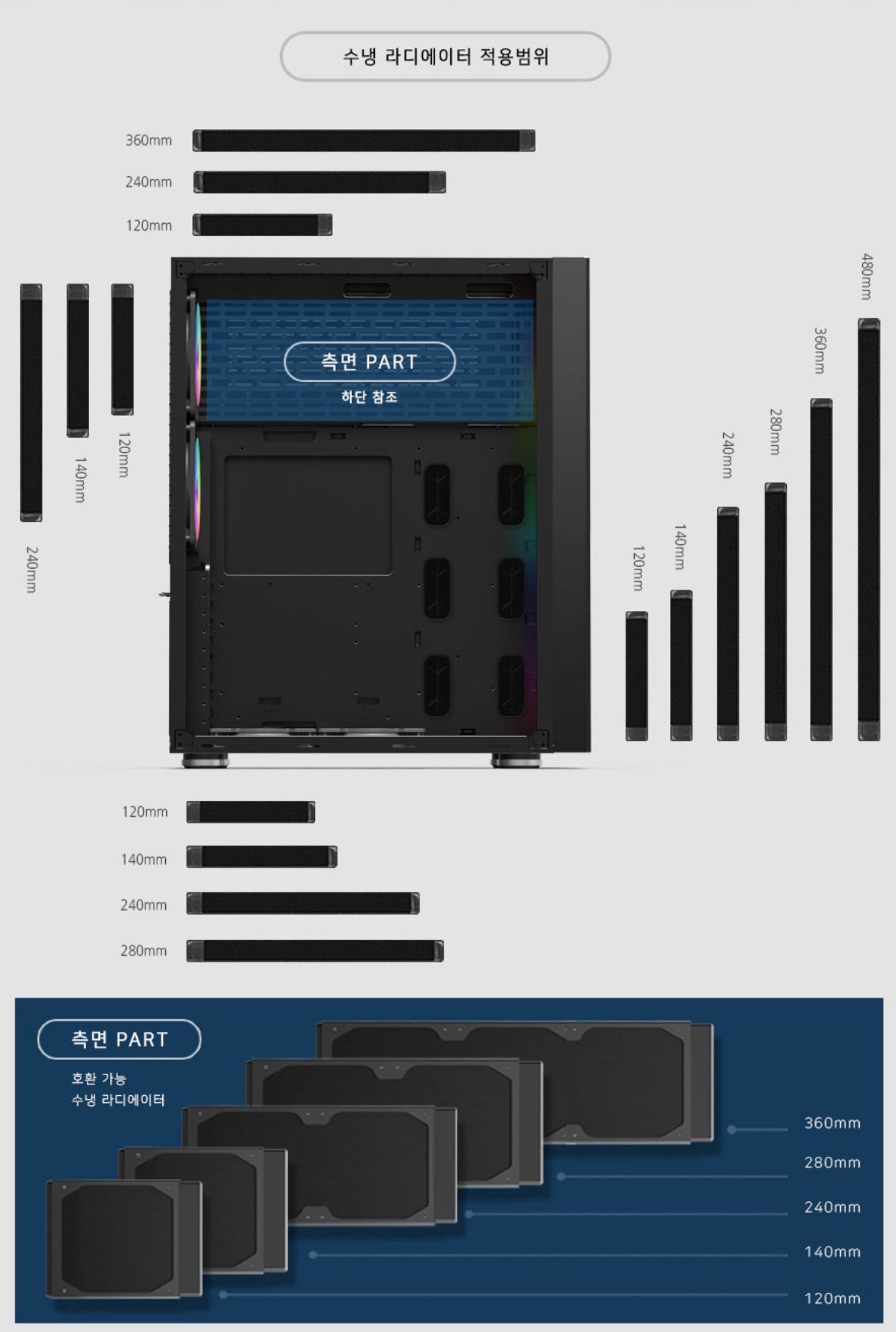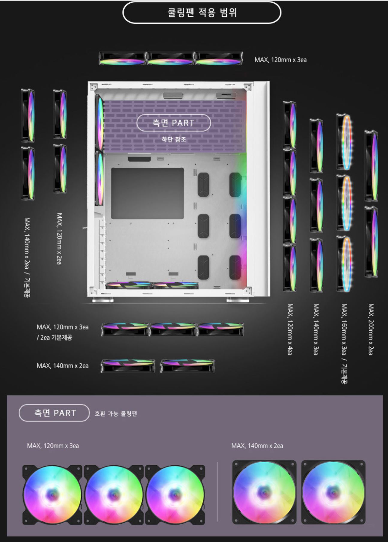 전면, 하단, 상당, 측면, 후면에 120mm, 140mm, 160mm, 200mm등 다양한
