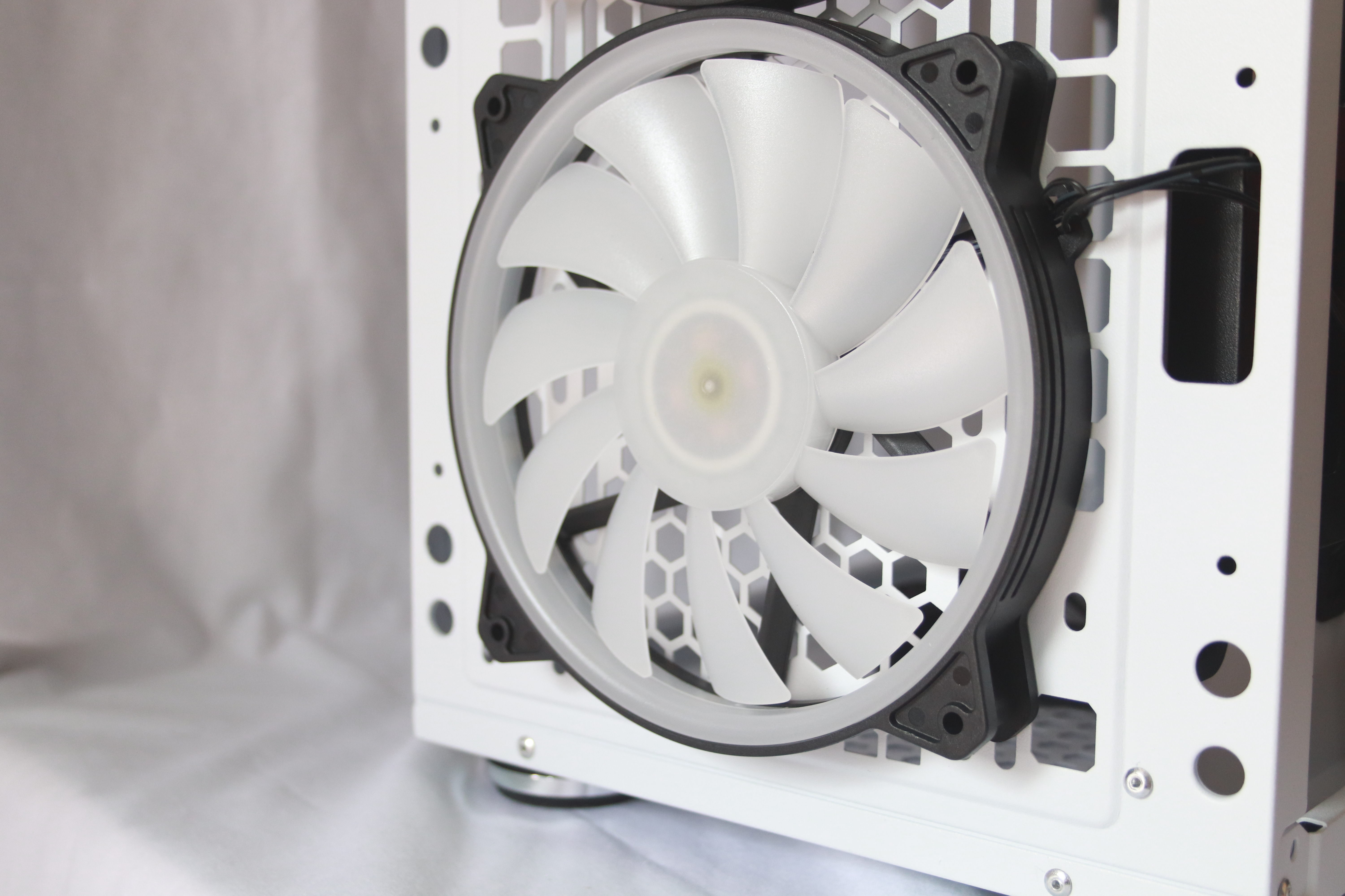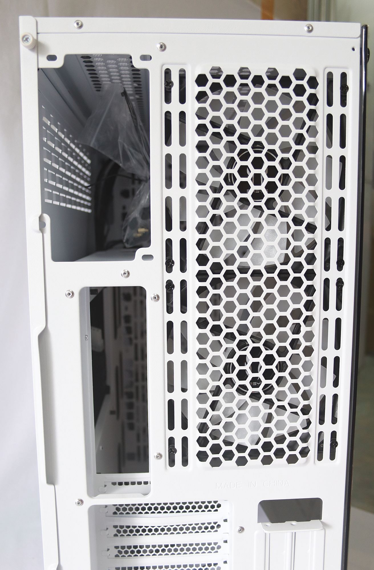 헥사곤 모양으로 타공된 배기부분 디자인인고 옆으로 난 120mm, 140mm 팬을 달 수 있는 나사 홀이 있으며