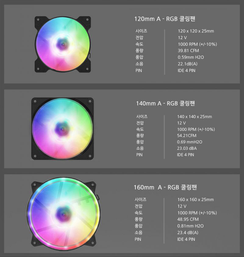120mm, 140mm, 160mm, 200mm등 다양한 팬들을