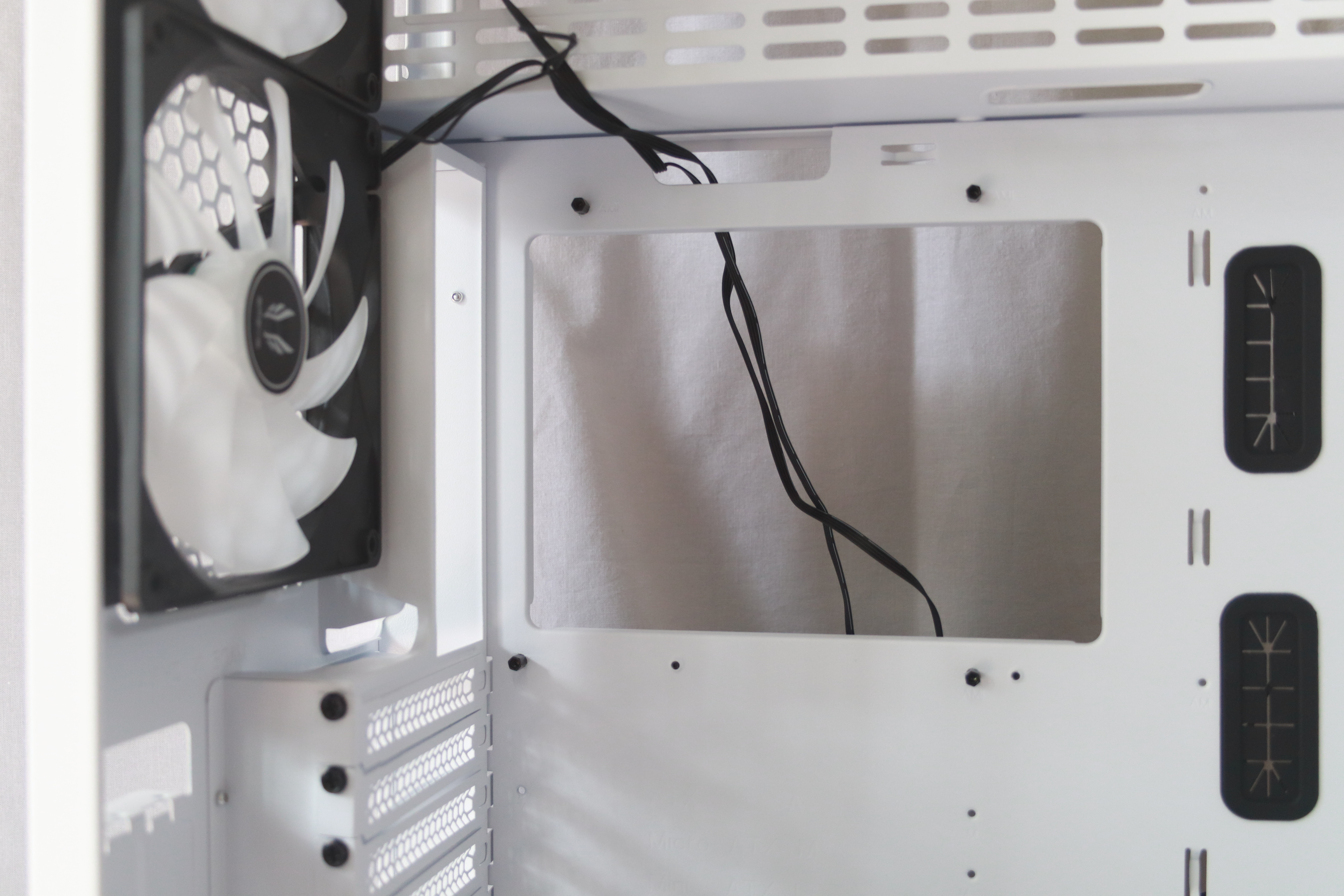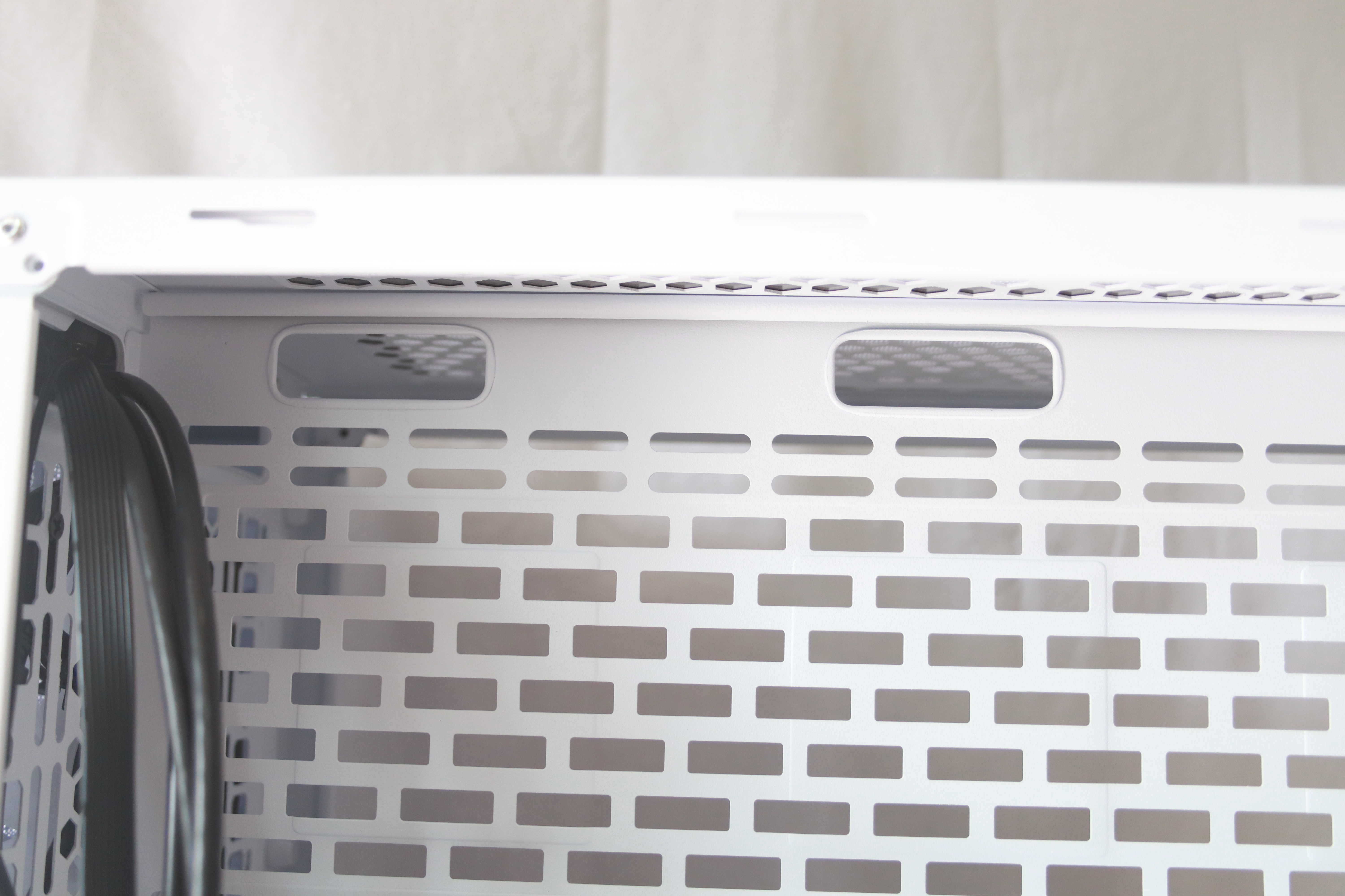 그 위쪽으로는 측면으로 라디에이터나 팬을 달 수 있는데 팬에서 나오는 선을 정리하기 쉽게 선 정리 홀이 있는 것을 확인 할 수 있다.