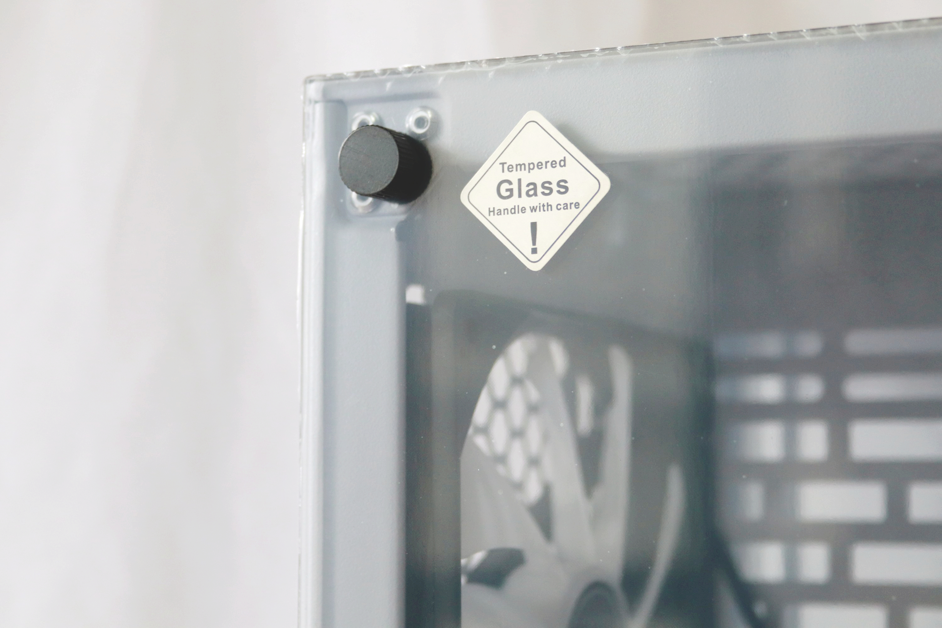 좌측 강화유리 패널로 구성이 되어 있으며 핸드 스크류 4개로 고정이 되어있어 간편하게 분리가 가능하다.