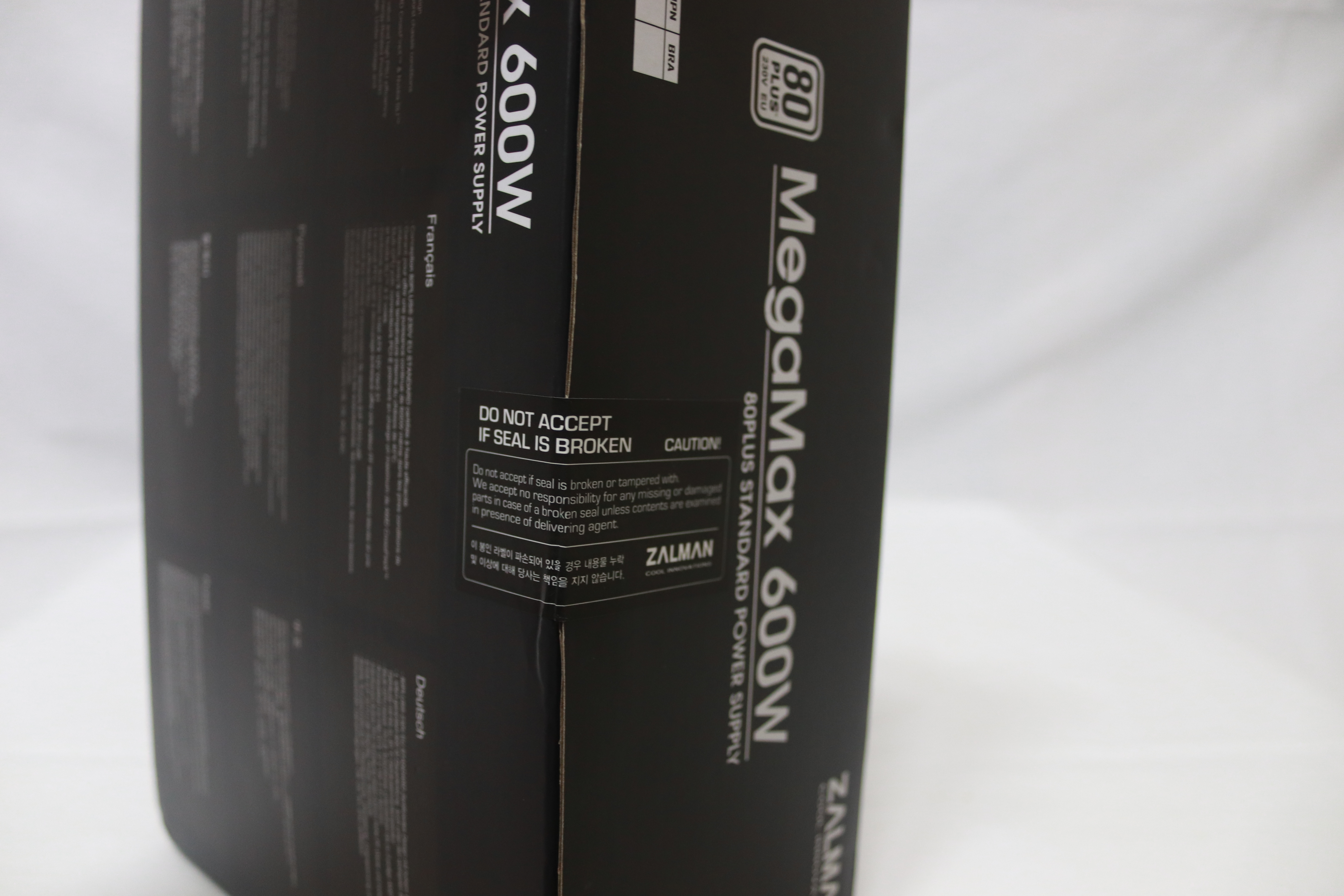 펜타곤 타공 형태의 블랙 박스 디자인이 상당히 예쁘다 전면에는 잘만 마크와 메가맥스 브랜드 그리고 80플러스 인증을 받았다는 마크가 있다. 뒤쪽에는 간단한 설명이 각 나라 언어별로 적힌 것을 확인할 수 있다.