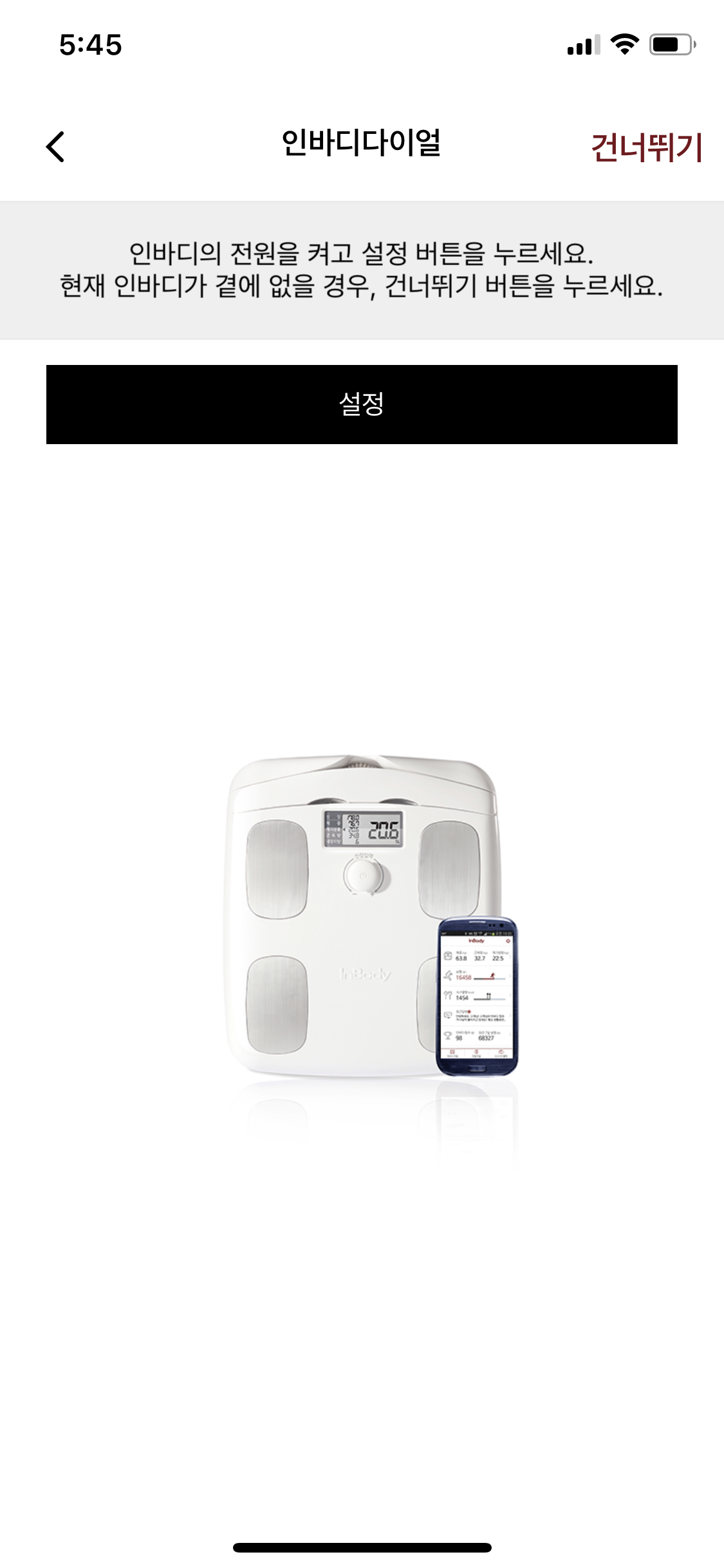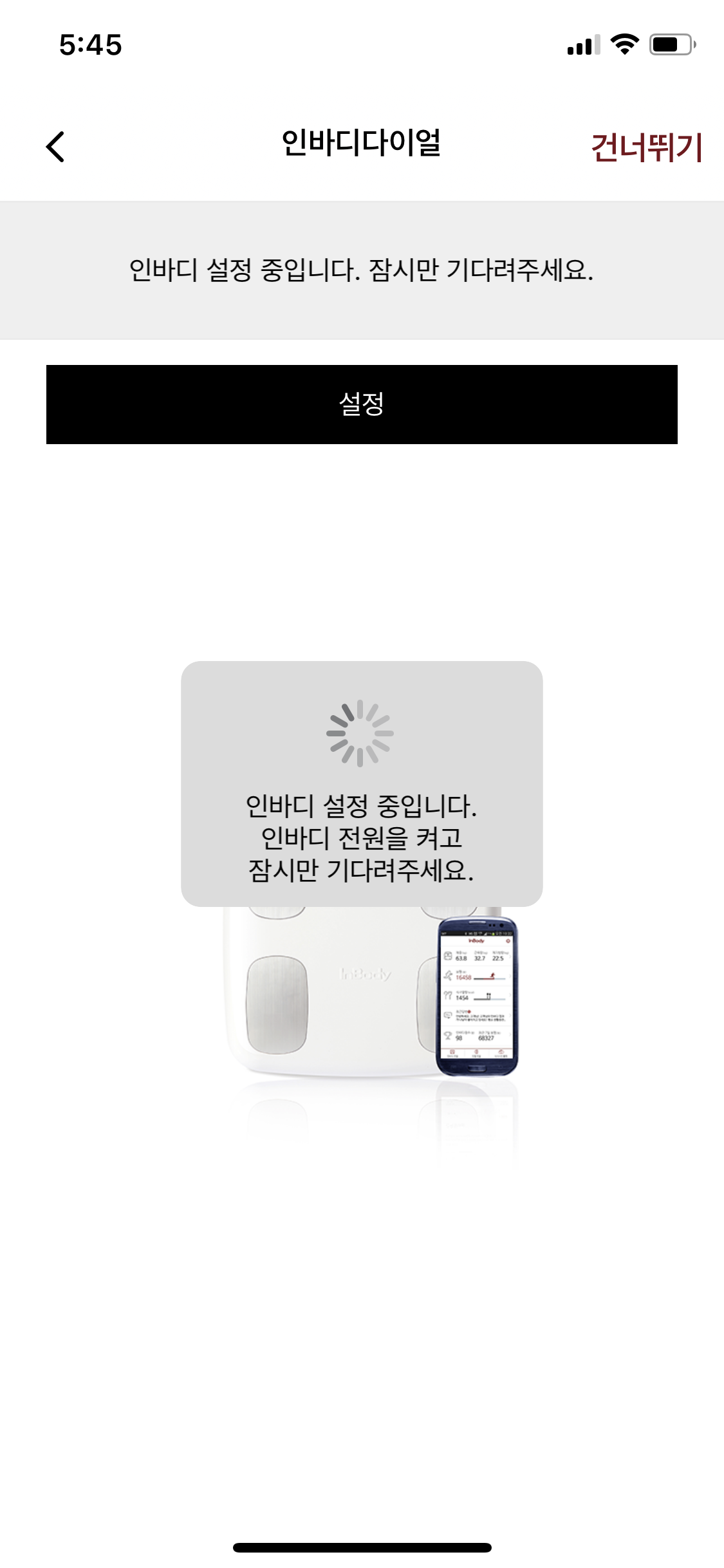 그러면 인바디 다이얼을 설정을 할 수 있는 곳이 뜰텐데요 설정을 눌러주신 다음 메세지가 보이면 인바디 전원을 한번 켜주세요 그러면 조금후 인바디와 연결이 됩니다.