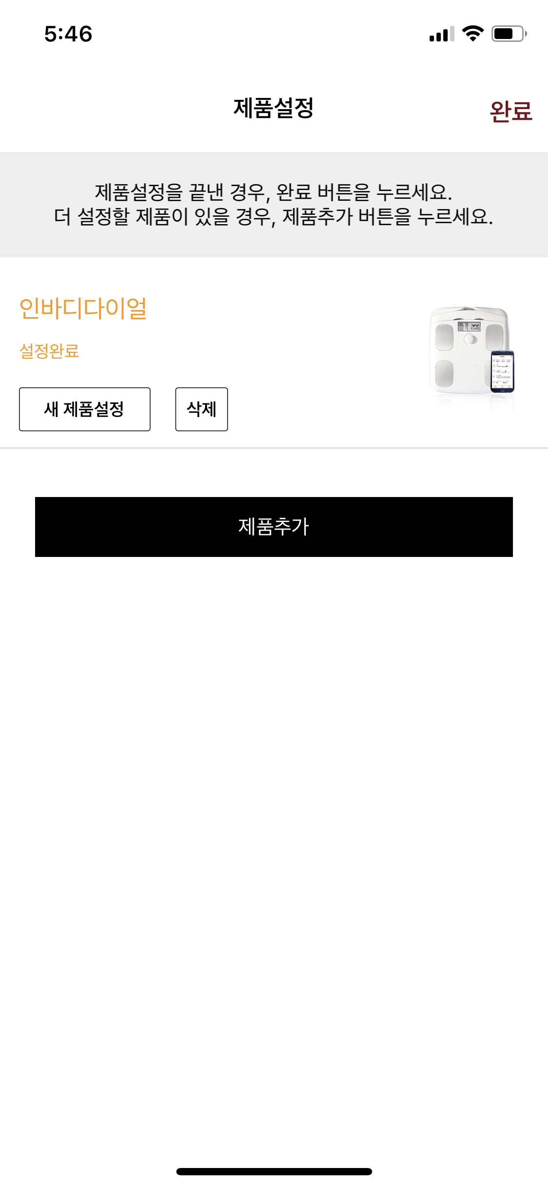 제품 설정창에 설정완료라고 뜨면 제품이 연결이 완료가 된 것입니다.