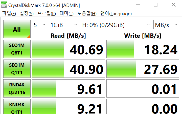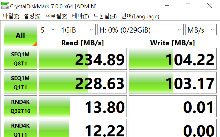 크리스탈디스크마크로 한번 테스트를 해 보았습니다.