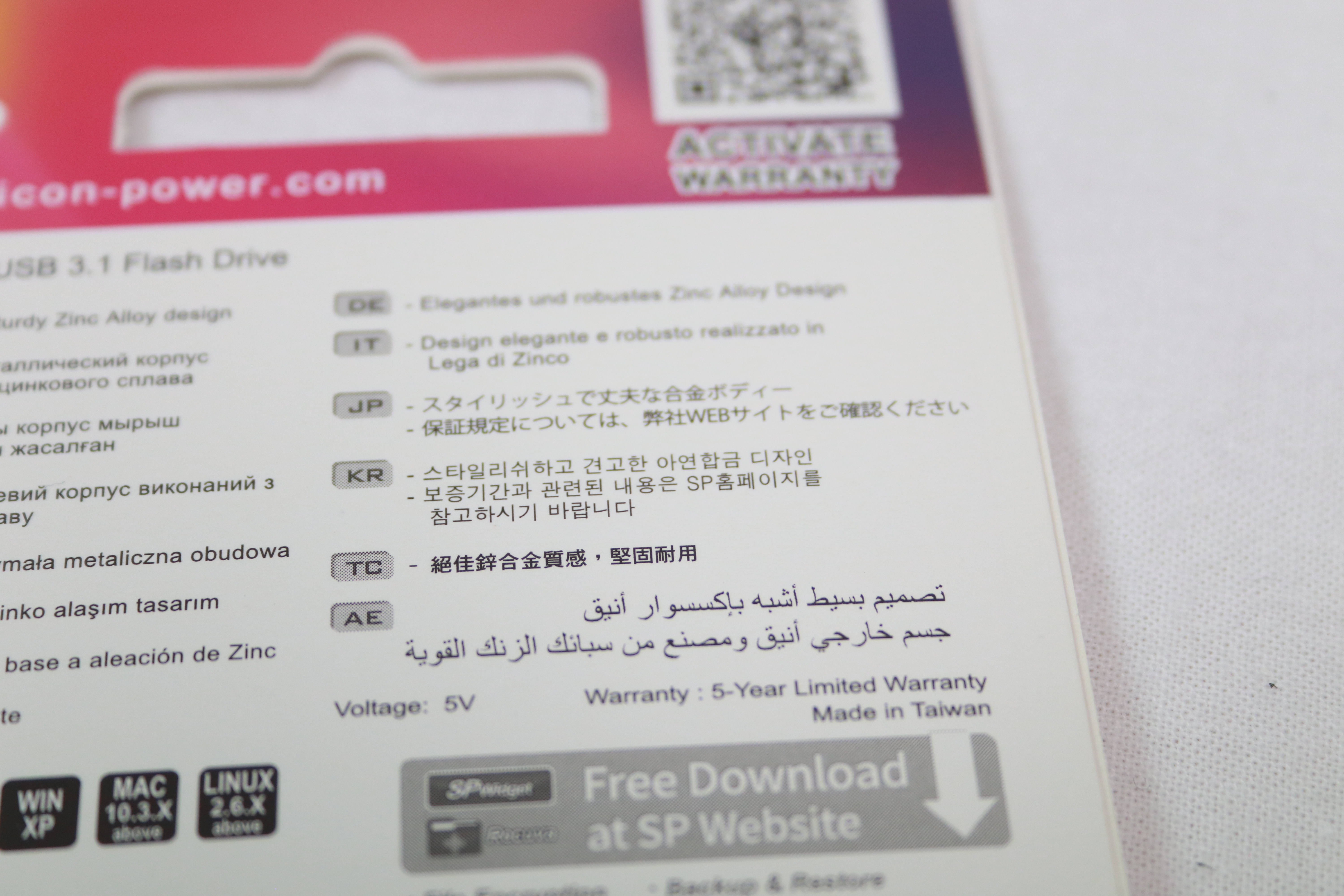 뽁뽁이를 제거하고 보았습니다. 심플하고 깔끔한 디자인의 열쇠고리형 USB가 들어가있는 것을 확인할 수 있습니다.전면에는 실리콘파워를 나타내는 브랜드 로고와 제품명, 제품의 용량등이 표시가 되어 있고 후면에는 다양한 언어로 제품에 대한 간단한 설명이 적혀 있는 것을 확인할 수 있습니다.