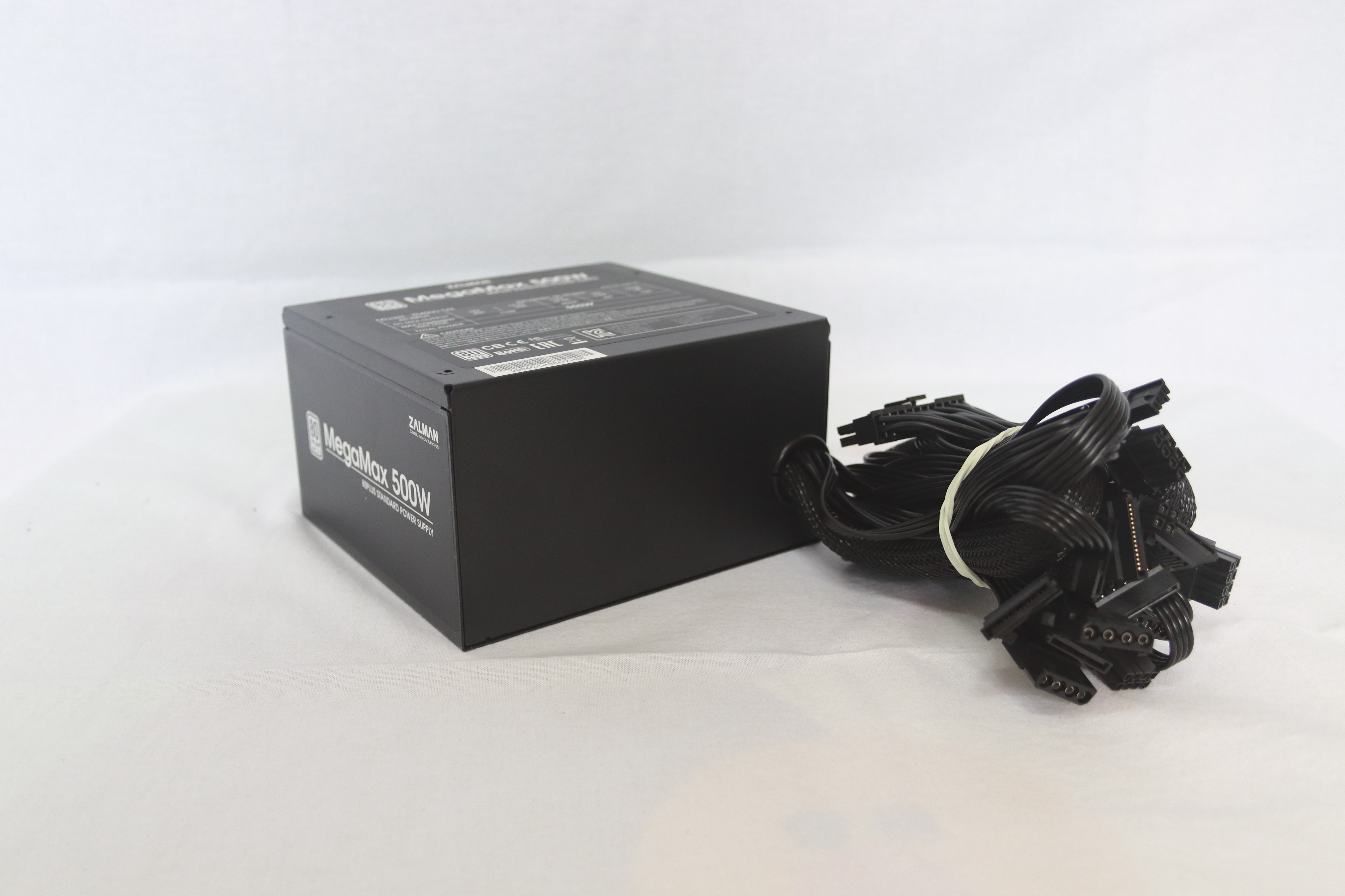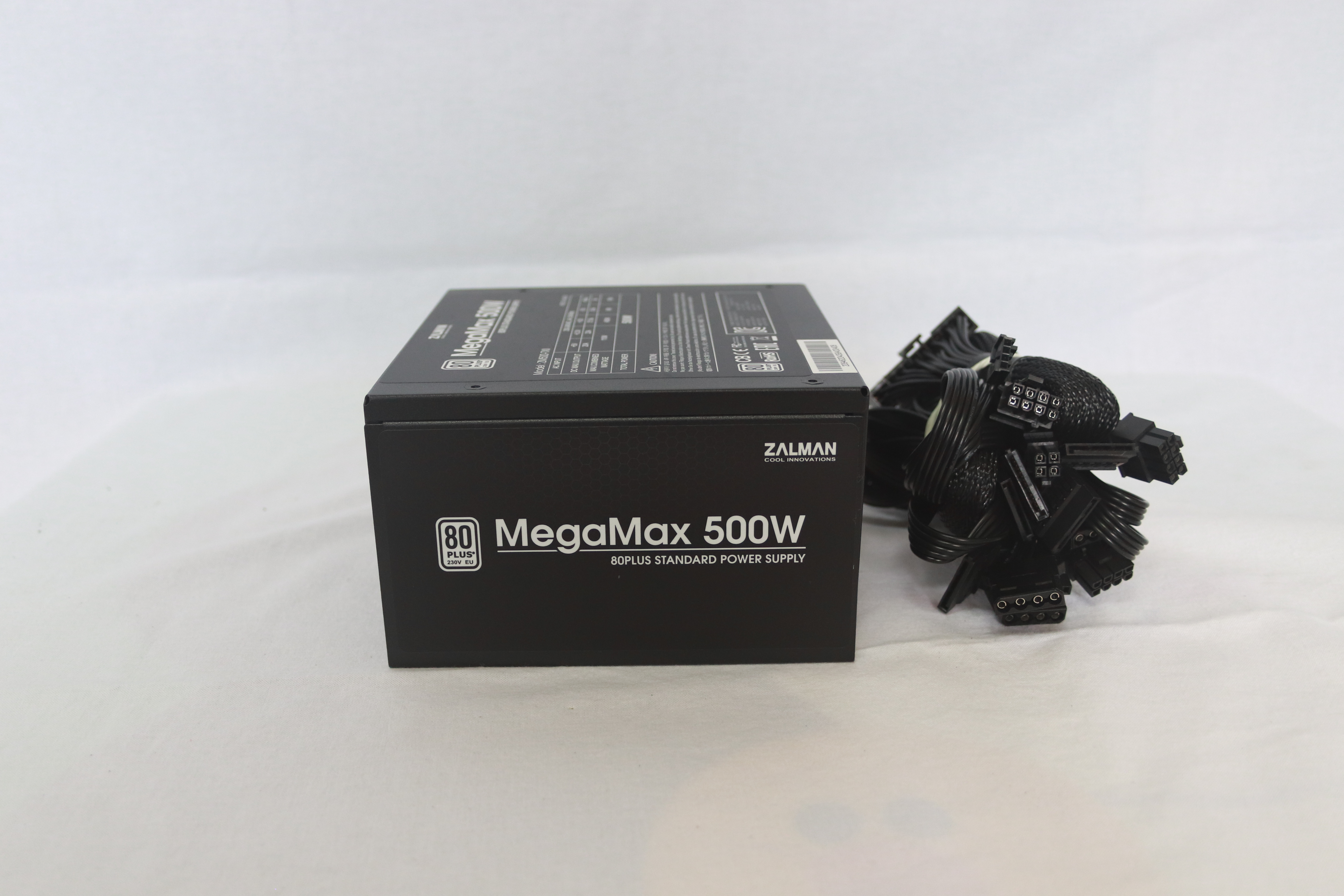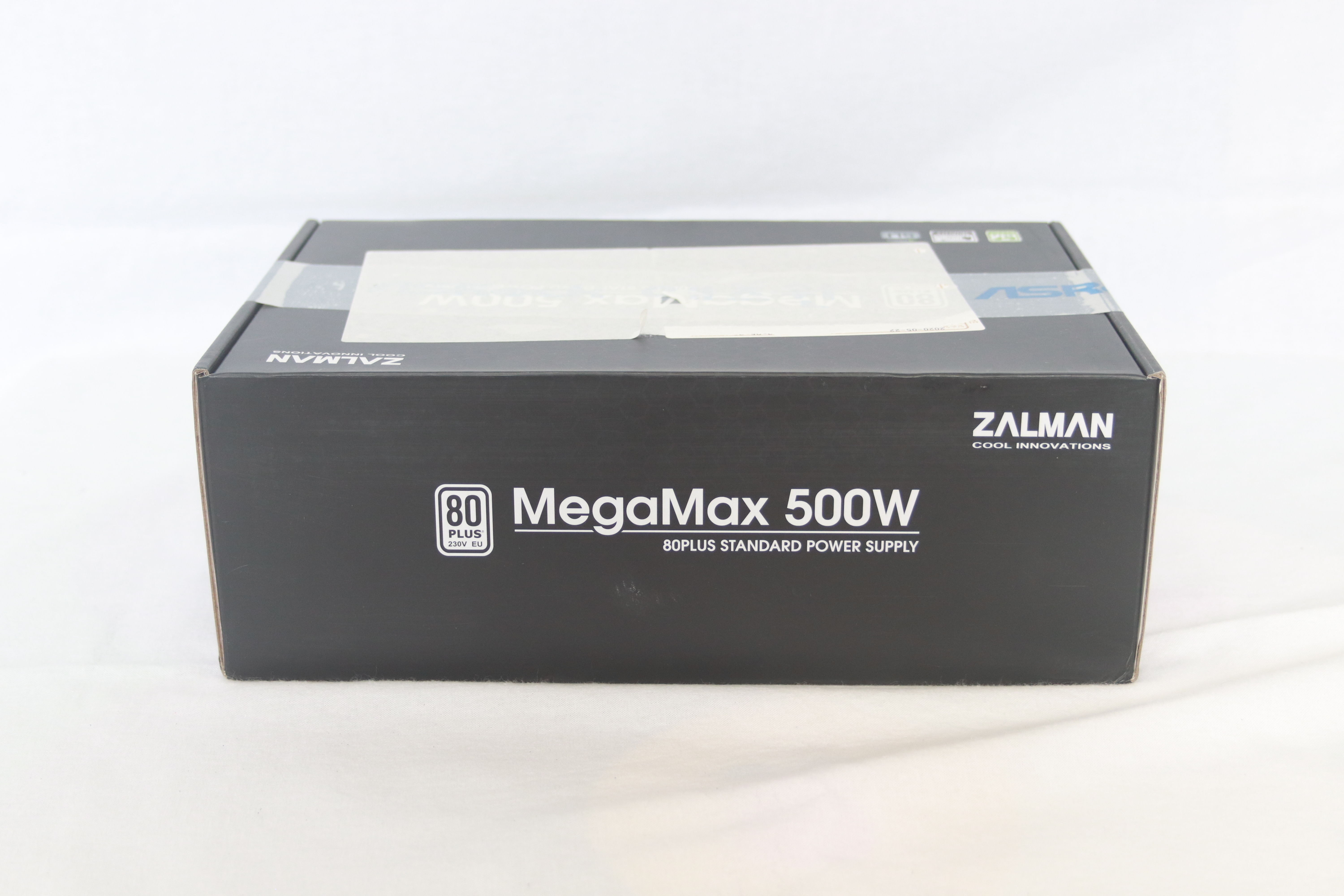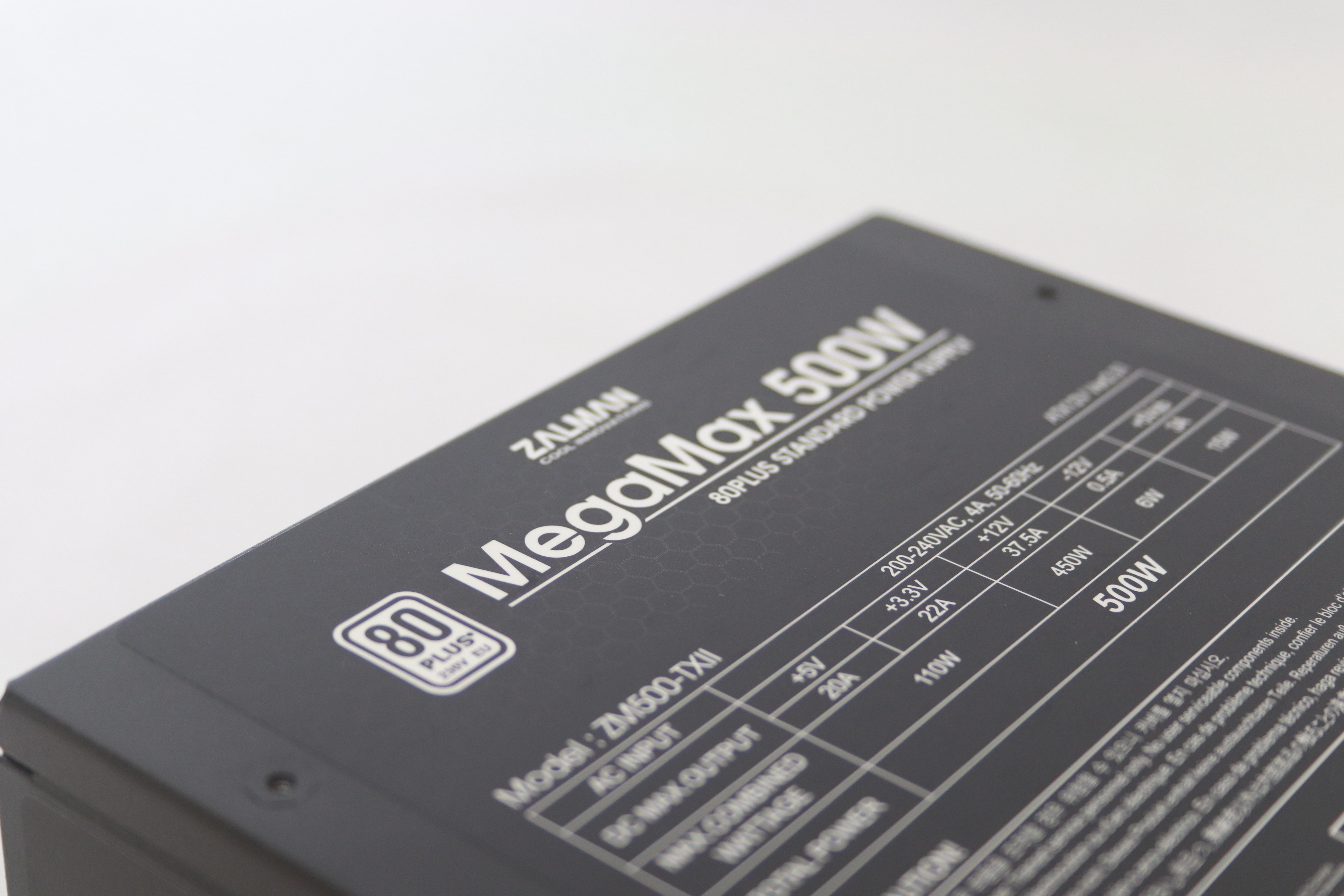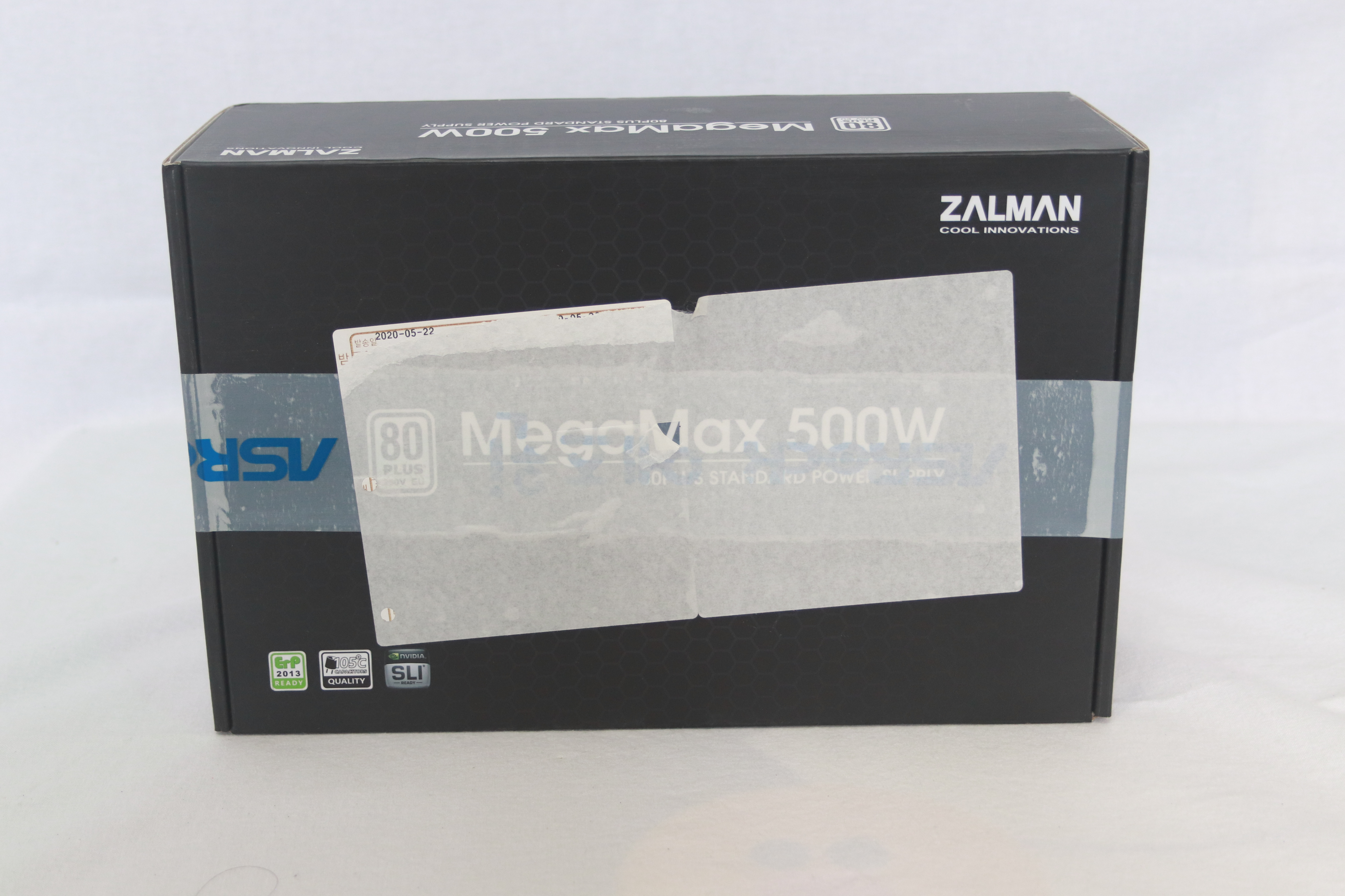 또 다른 옆면에는 잘만테크 MegaMax 500W의 명칭과 함께 80Plus 인증 마크가 붙어 있다.