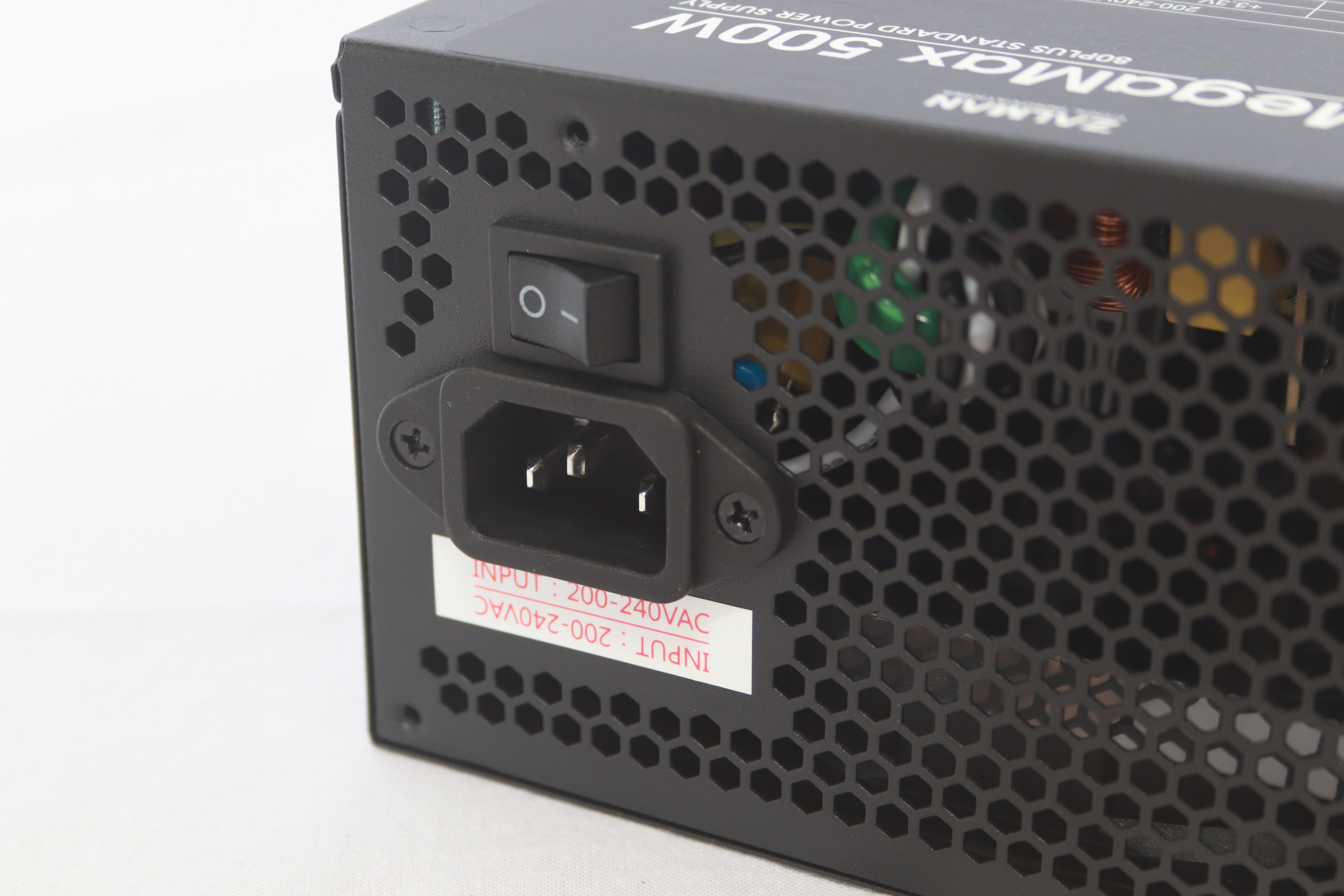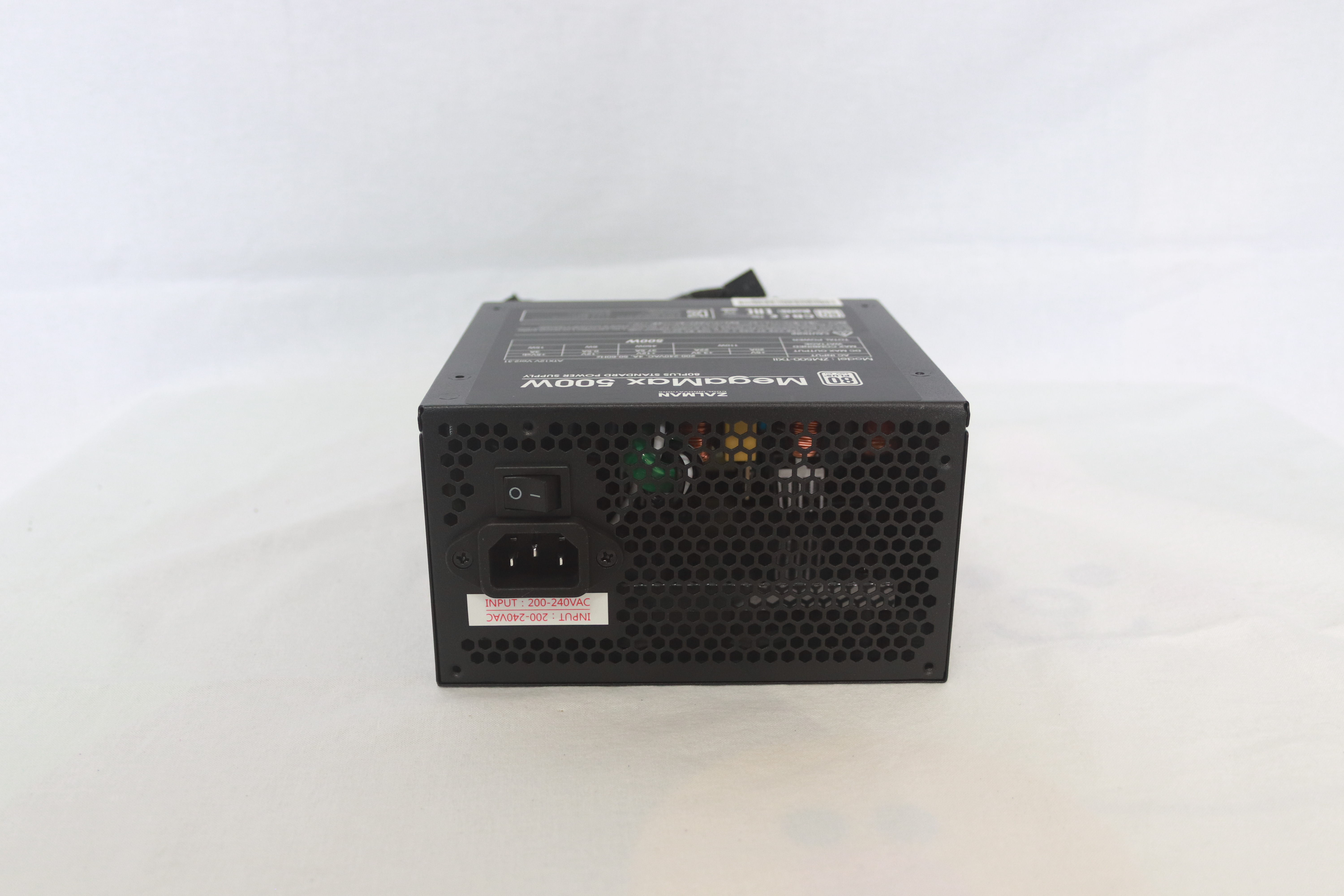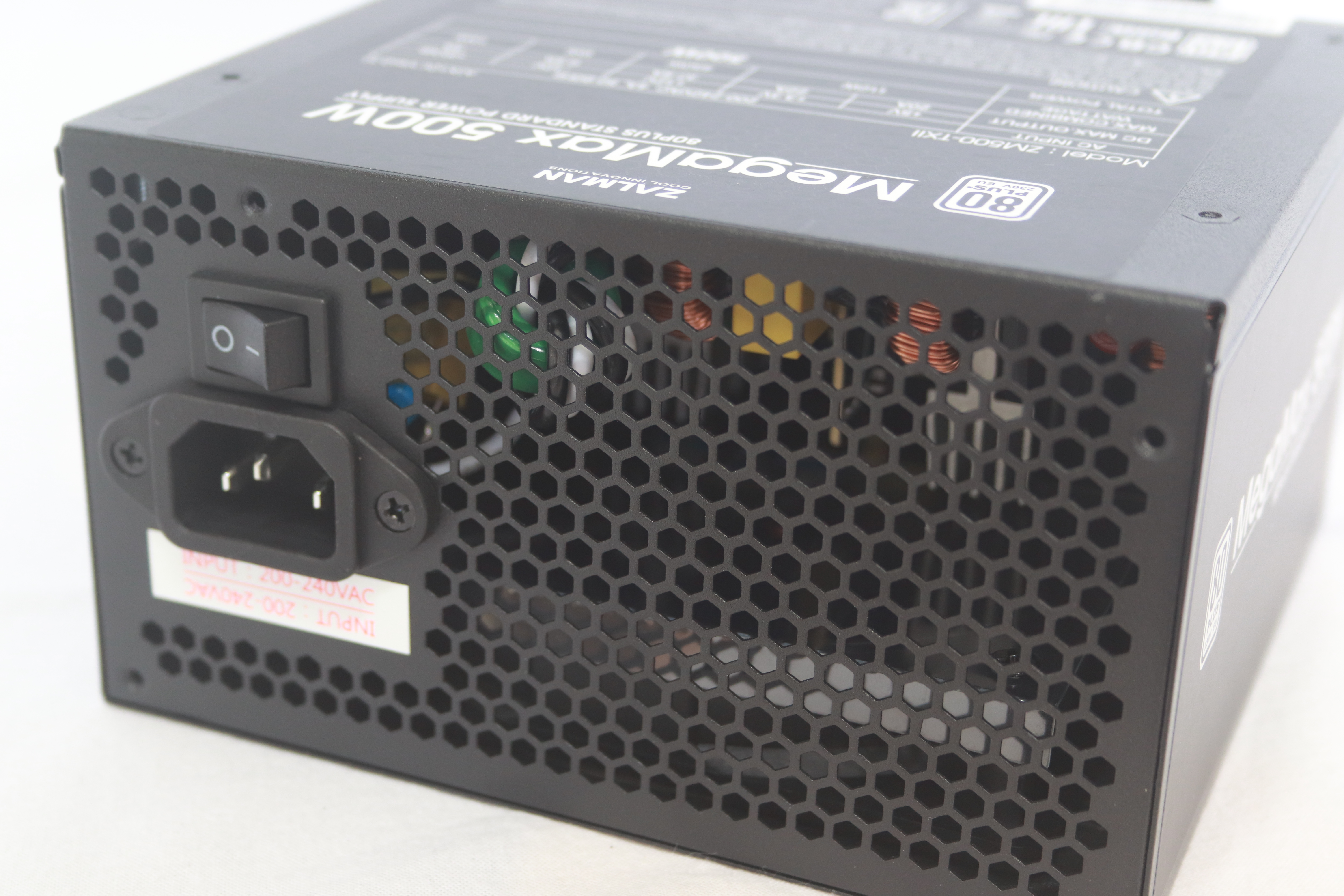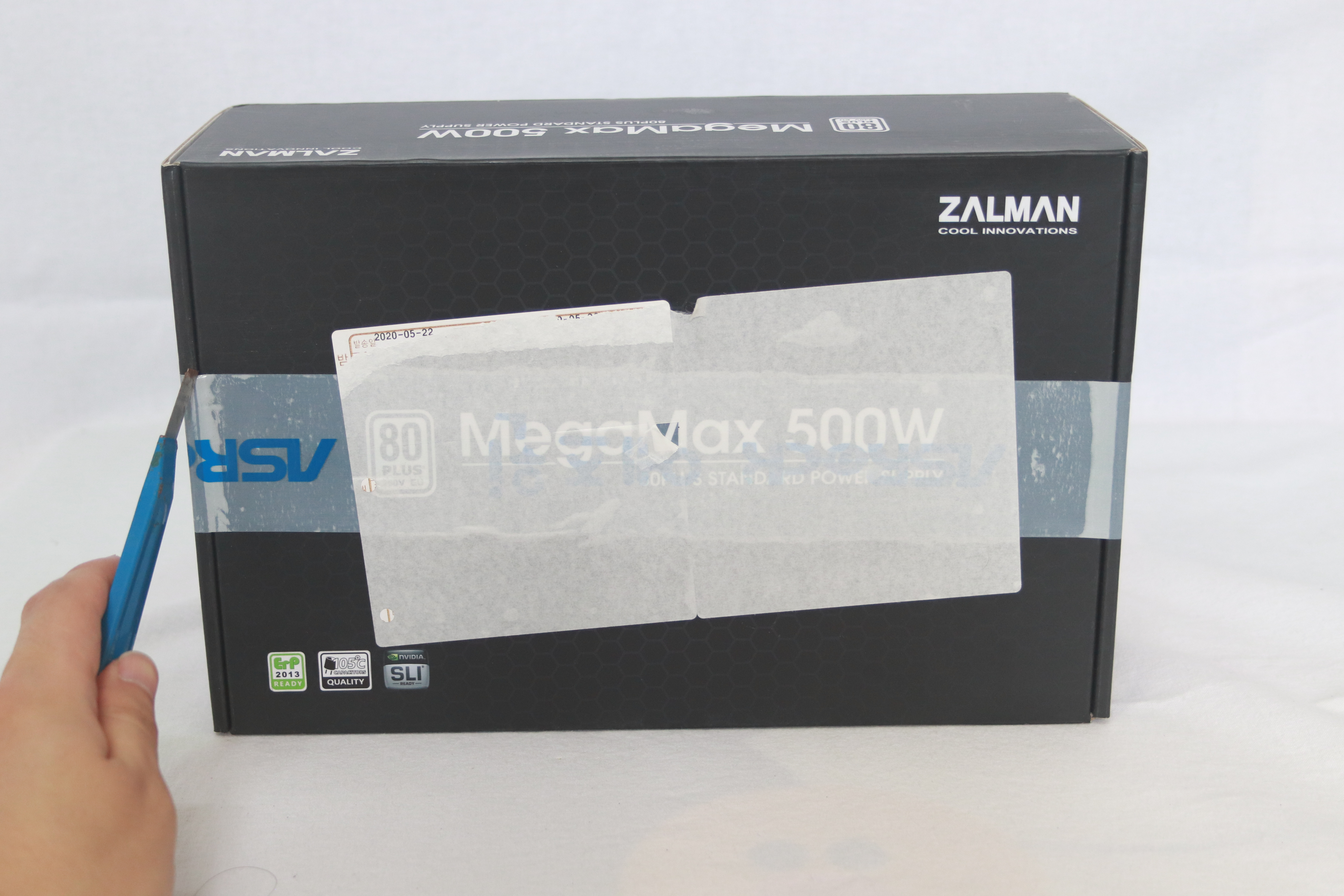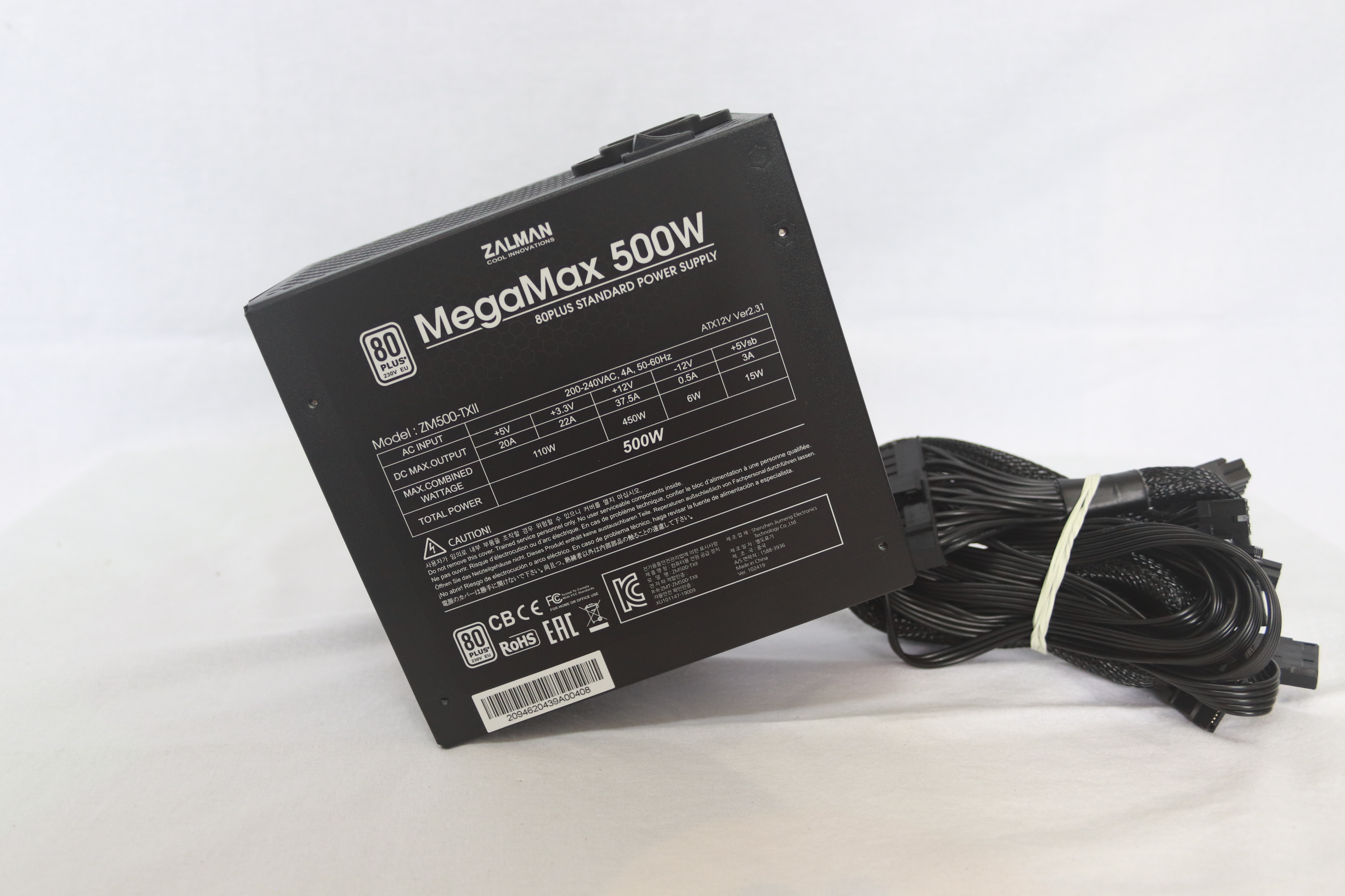또 다른 옆면에는 잘만테크 MegaMax 500W의 명칭과 함께 80Plus 인증 마크가 붙어 있다.