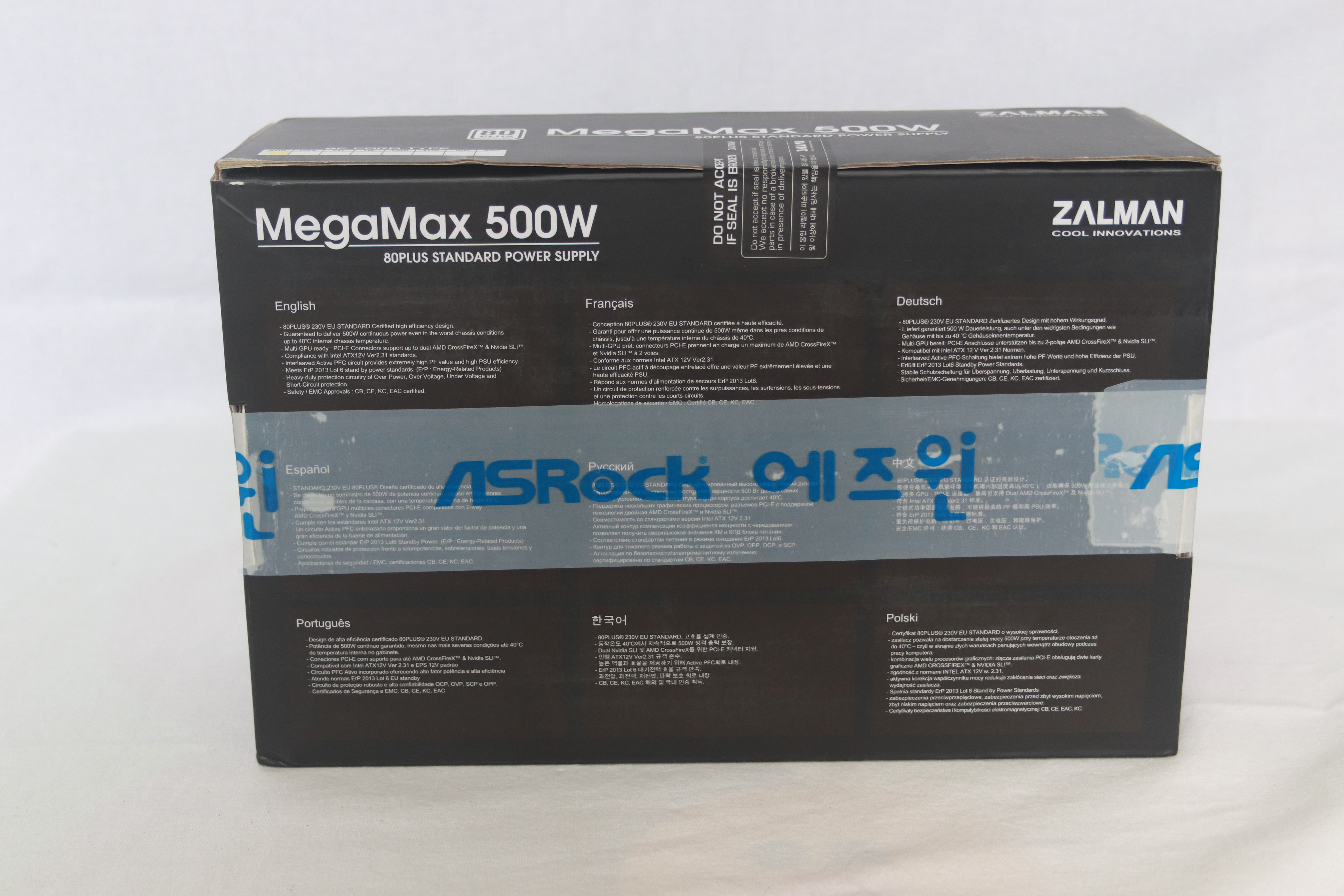 뒤쪽으로는 다양한 언어로 간단한 잘만테크 MegaMax 500W에 대한 설명이 있는 것을 볼 수 있다.