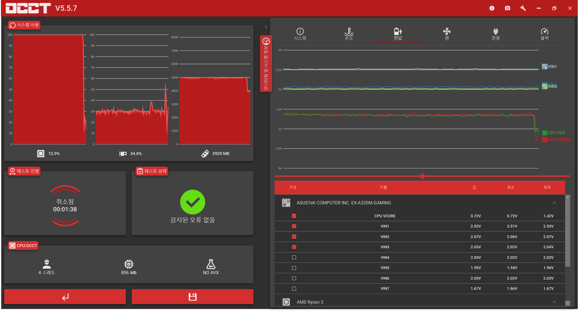 OCCT 측정 결과 전압 수치는 특별히 잘못된 점이라 할 것은 없이 상당히 안정적인 모습을 확인할 수 있다.